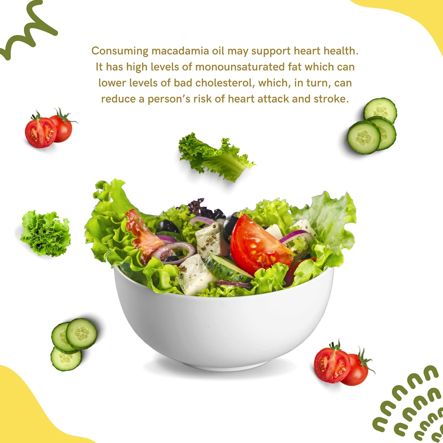 - Superfood Oil- It is exceptionally rich in monounsaturated fats, the healthiest type of fat known to support heart health and improve cholesterol levels. With higher levels of these beneficial fats than most other nuts and seeds, macadamia oil is a superior choice for those prioritizing wellness. Its naturally buttery, smooth flavor enhances a variety of dishes, making it perfect for health-conscious consumers who refuse to compromise on taste.