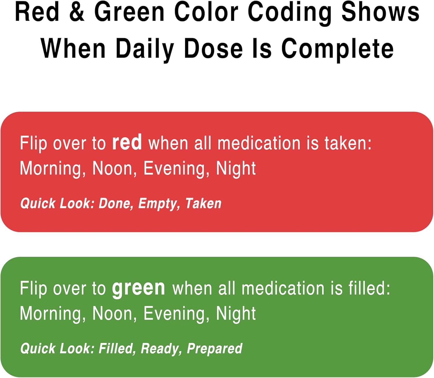 - FOUR DAILY COMPARTMENTS: Daily pill boxes have 4 compartments (morning, noon, night, evening) and can hold up to 64 pills or vitamins each day. Red & green color coding using the date or simple numbering system make it easy to know where to begin and end each day.