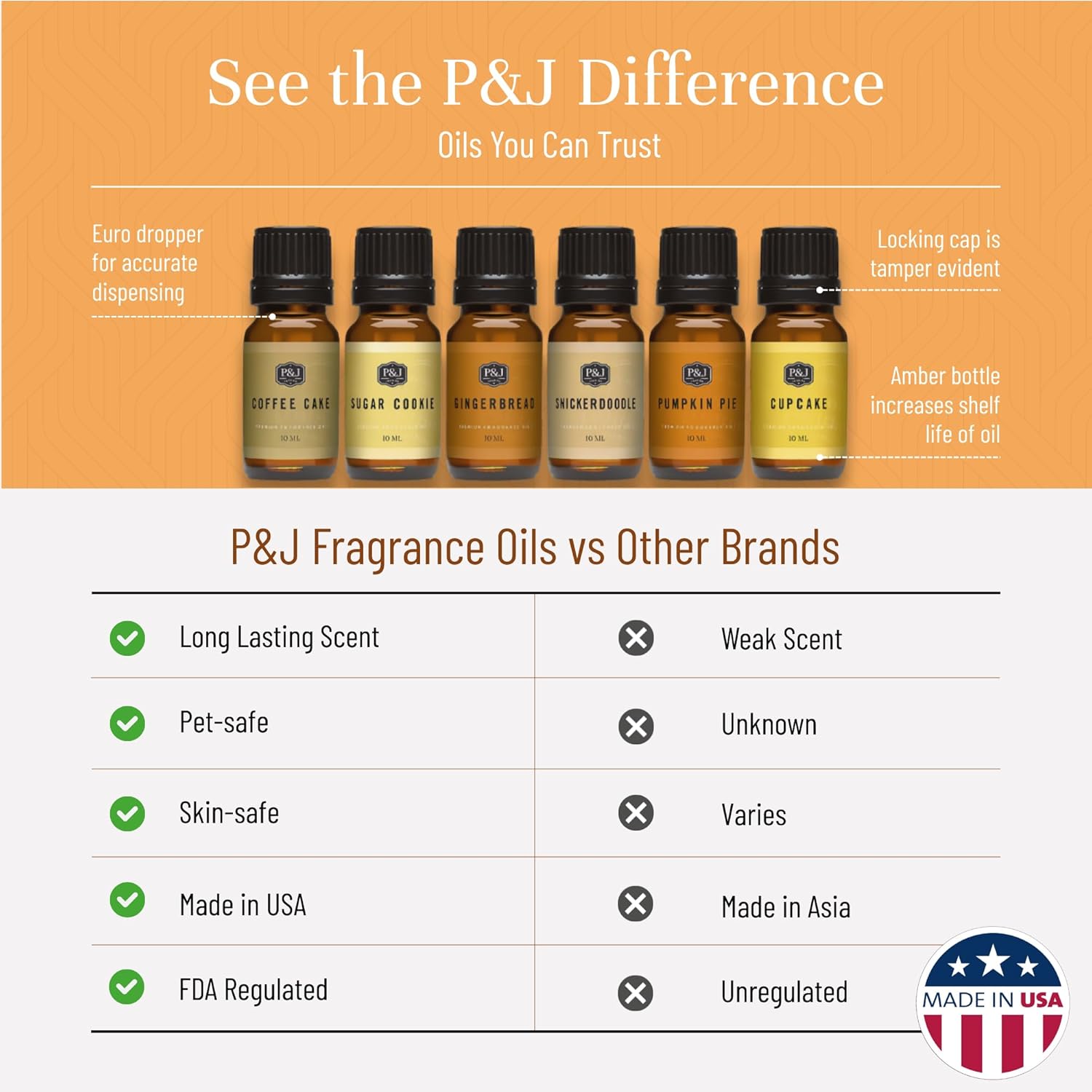 - Premium Grade: P&J fragrances oils are highly concentrated with a strong scent. With more than 30 years in the industry, these enhanced formulations were developed by our IFRA certified master perfumers. Our oils are safe and ideal for every home.