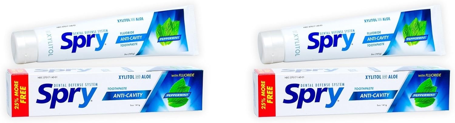 Spry Natural Xylitol Toothpaste 5oz for Adults and Kids with Fluoride, Gentle for Sensitive Teeth Whitening and Remineralizing, Breath Freshening, Mouth Moisturizing, Peppermint (Pack of 2)