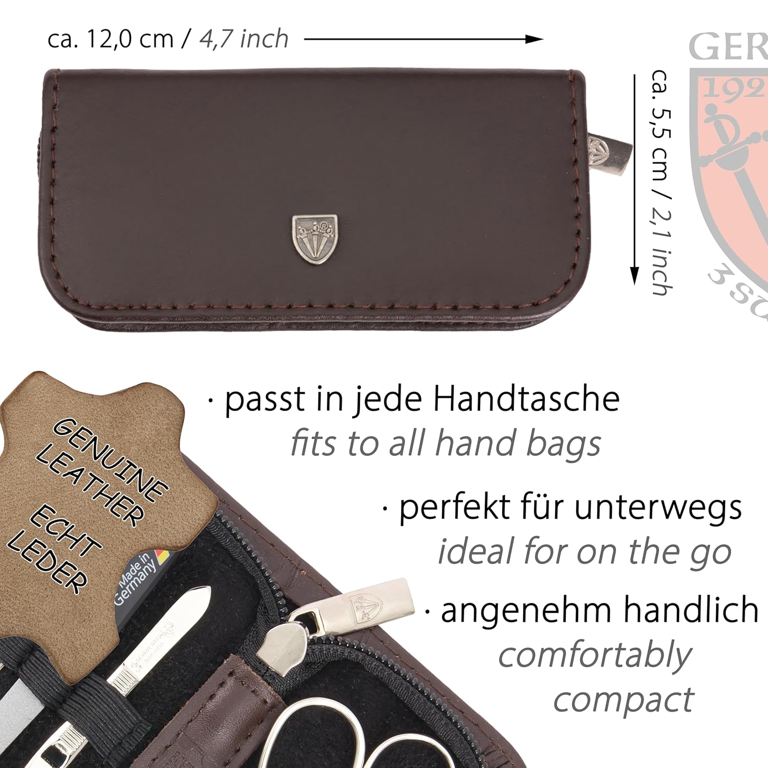 3 Swords Germany - brand quality 5 piece manicure pedicure grooming kit set for professional finger & toe nail care scissors clipper genuine leather brown case in gift box, Made in Germany