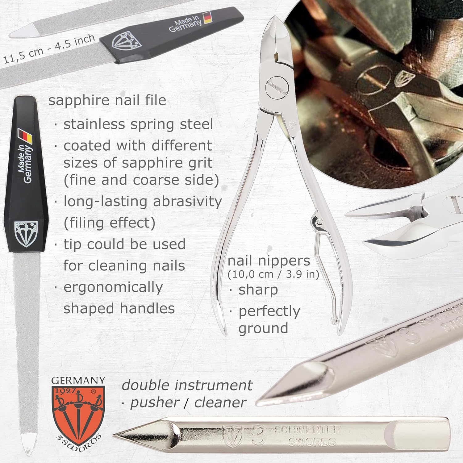 - NAIL CARE KIT from 3 Swords Germany with professional manicure and pedicure tools. Our sets for home and travel use convince trough highest levels of quality, modern design, durability and German engineering combined with a first class customer service.