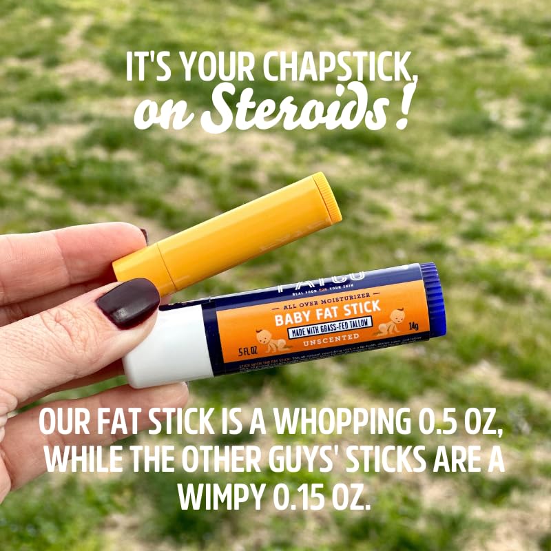- ALL NATURAL INGREDIENTS - Our Fat Stick contains tallow from grass-fed, pasture raised cows, as well as tons of other natural ingredients like sweet almond oil, beeswax, cocoa seed butter, shea butter, coconut oil, rosehip fruit oil, kukui seed oil, and olive fruit oil