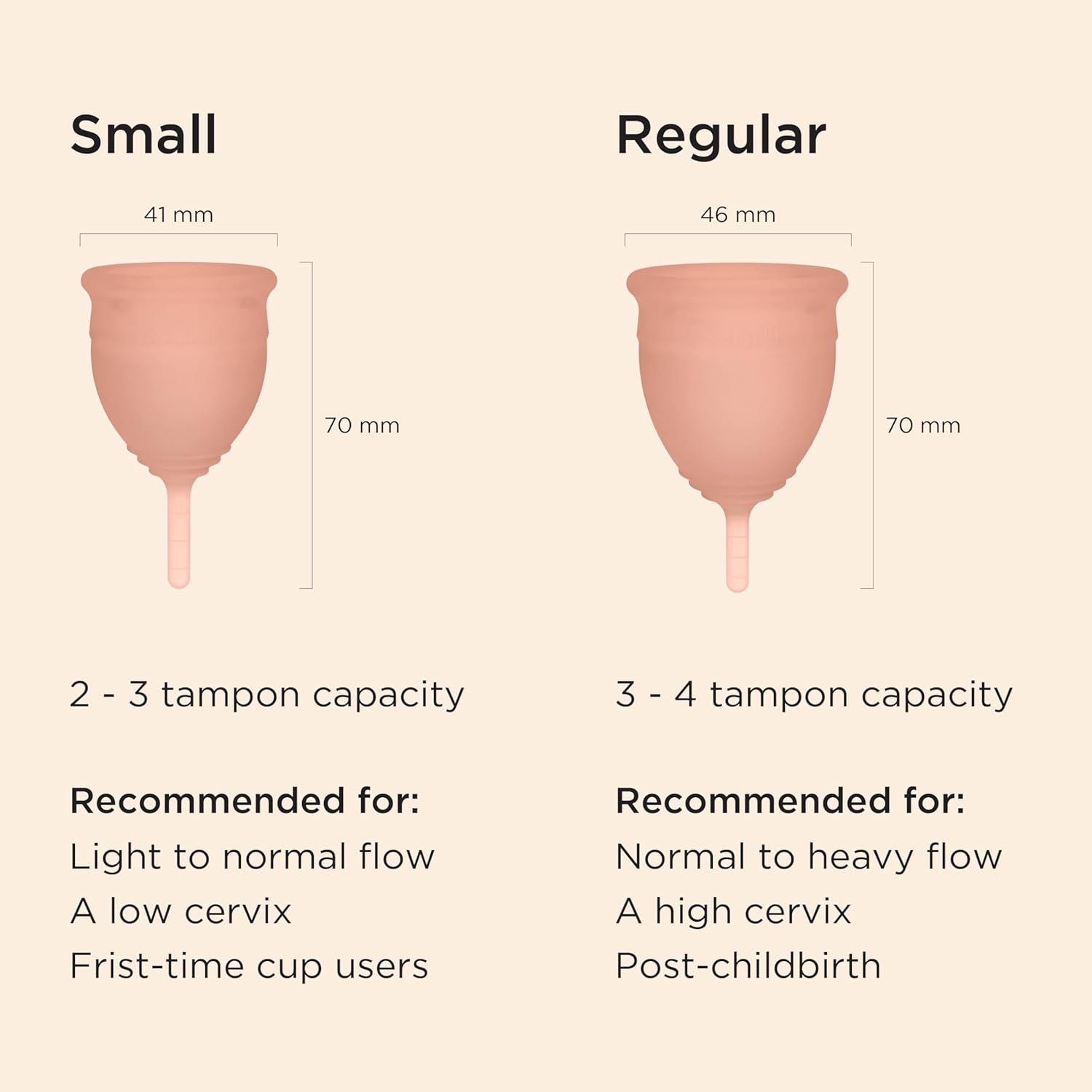 - FLEXIBLE FIT FOR LEAK-FREE COMFORT: The soft period cup moves with your body for up to 12 hours of protection, even overnight. Small = light to normal flow (2–3 tampons), Regular = medium to heavy flow (3–4 tampons).