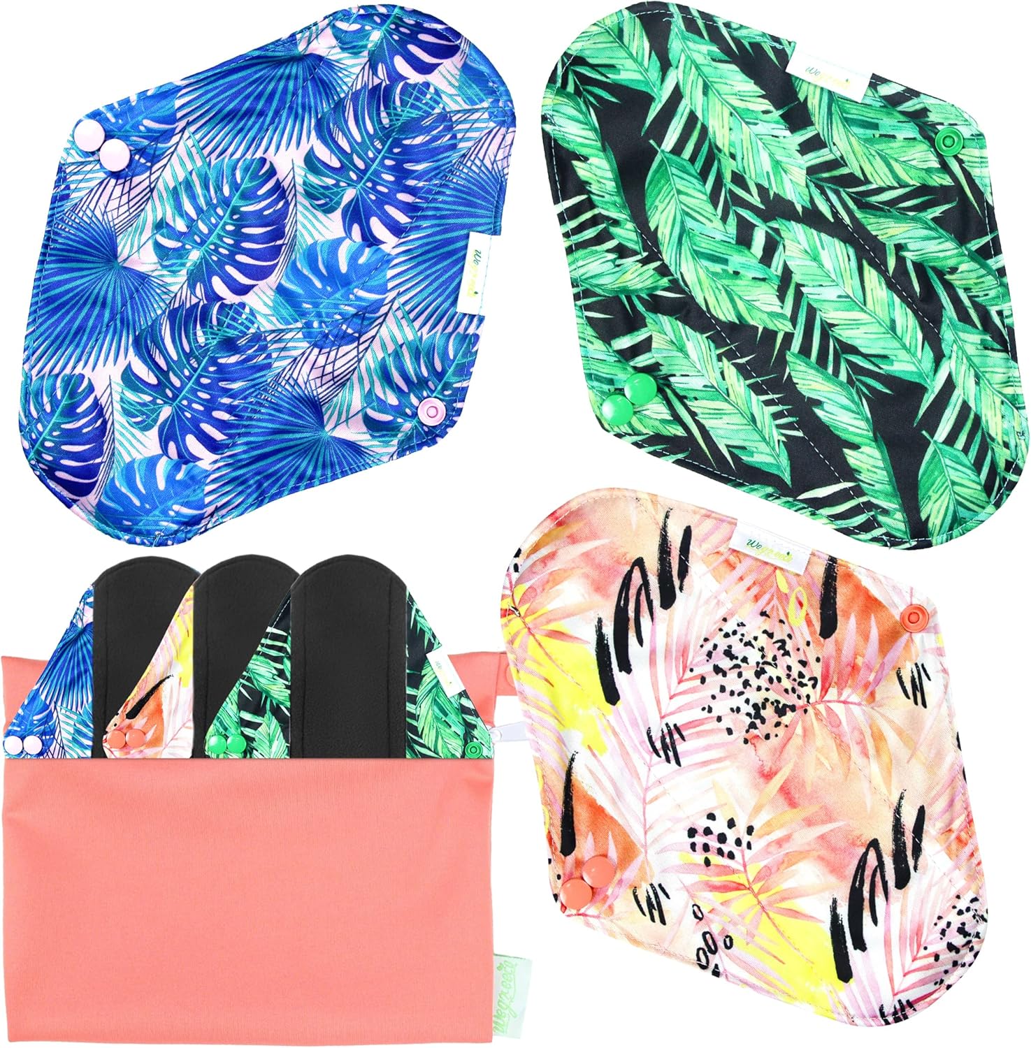 wegreeco Reusable Menstrual Pads - Reusable Sanitary Pads | Reusable Panty Liners | Soft Cloth Menstrual Pads - 6 Pack with 1 Cloth Mini Wet Bag (Large, Leaves