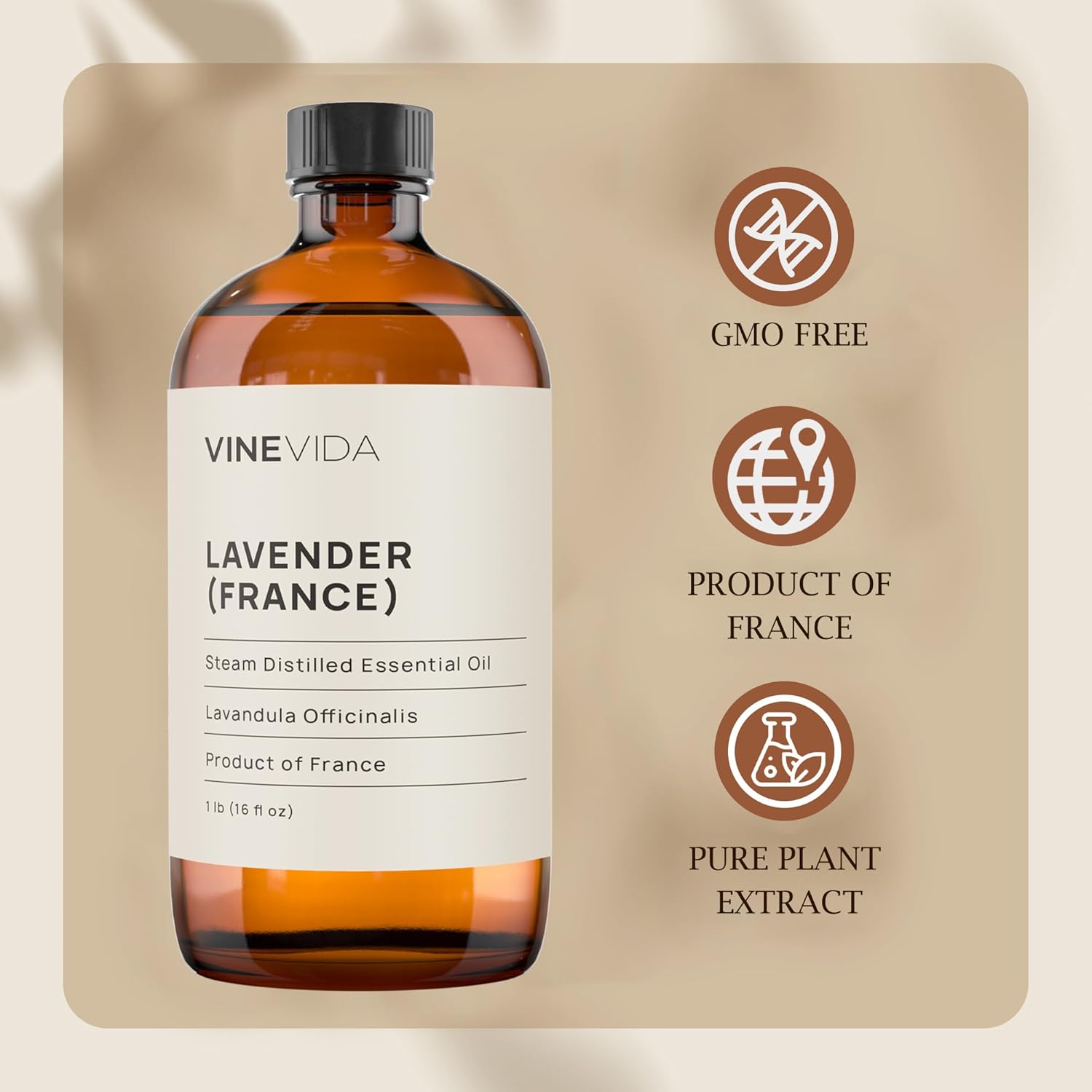 VINEVIDA Lavender France Essential Oil 16 oz - Undiluted Lavender Oil 16 oz - Lavender Candle Oil Scent - DIY Candle Scents for Candlemaking - Bulk Essential Oil for Soap Making Safe for Skin