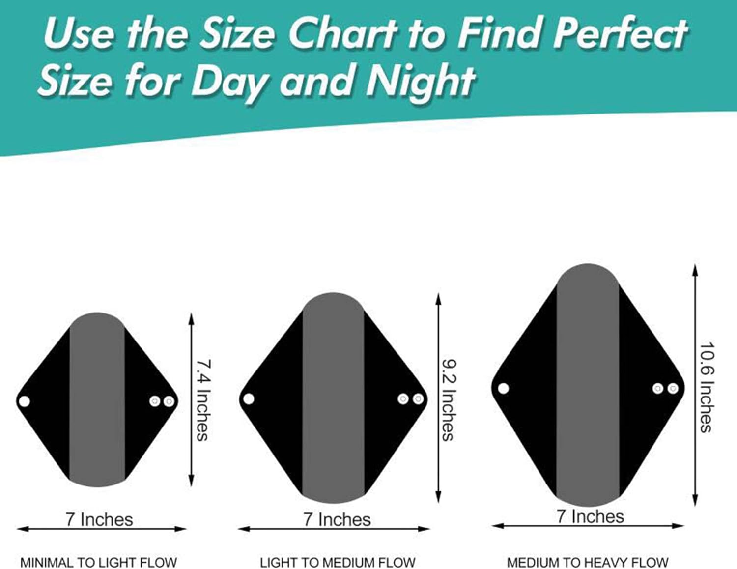 - 3 Size Available - Washable mentrual pads Small size 7.4inches Length X 7inches Width (including wings) ; Medium size 9.2 inches Length X 7.2 inches Width (including wings) ; Large size 10.6 inches Length X 7.2 inches Width (including wings).