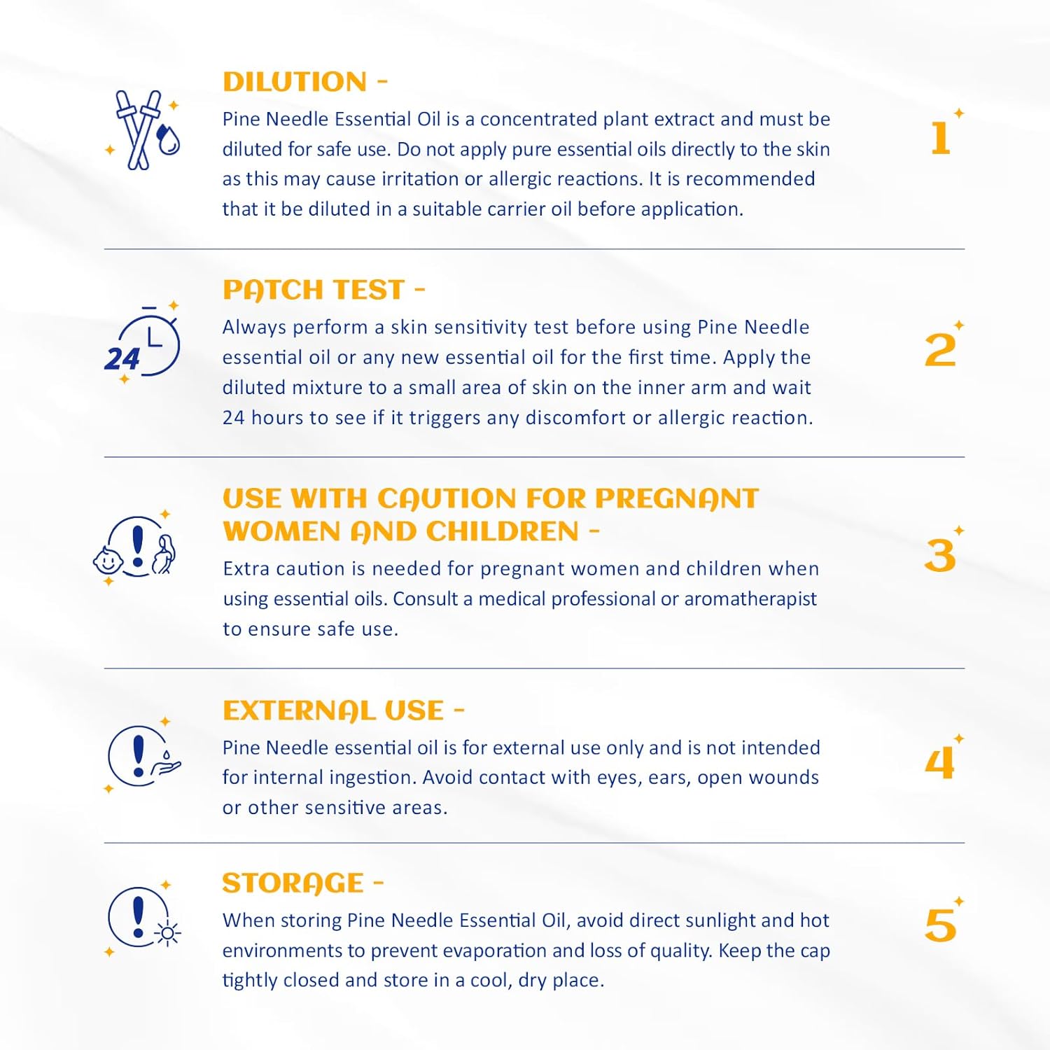 - Multiple Blend: The woodsy scent of winter pine oil essential blends well with various essential oils such as sweet orange, eucalyptus and clary sage. Dilute with carrier oil before use. Test on feet first for skin sensitivity prior to widespread use