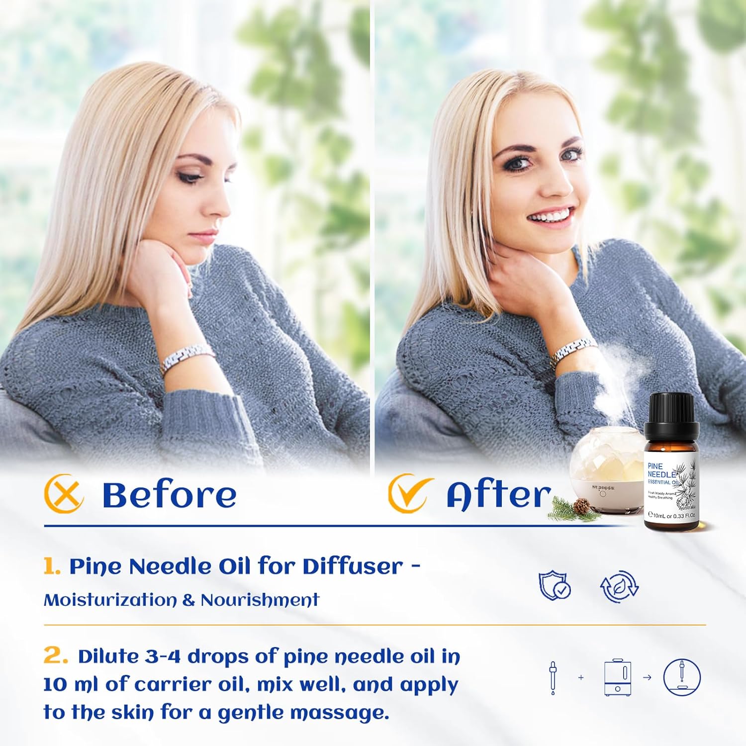 - Ingredient & Aroma: Pine needle essential oil has a fresh woody and earthy aroma, known for its calming and relaxing qualities. Our Fir needle oil is distilled from Australia fir needle. A few drops will set the Xmas mood