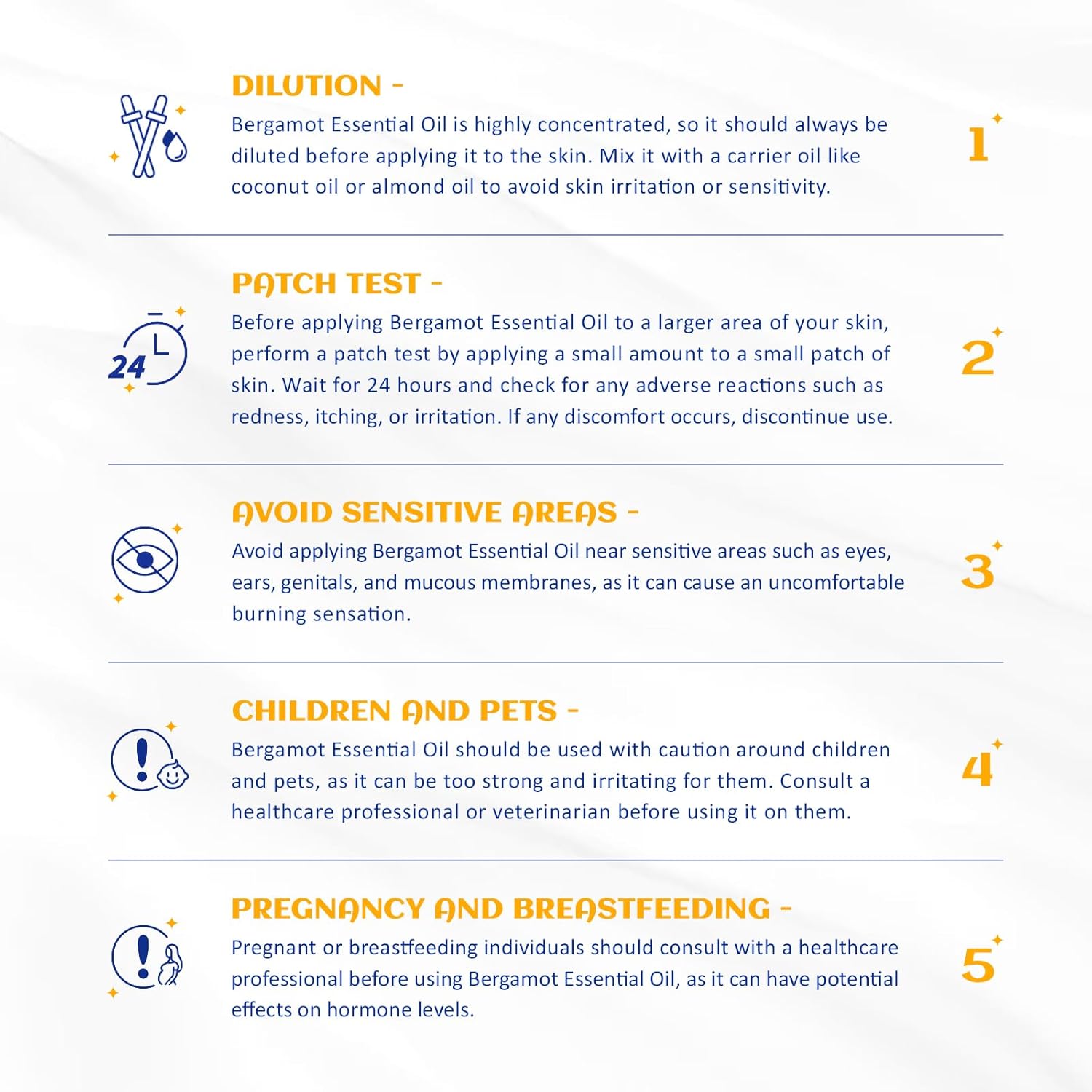 - [ 𝐁𝐥𝐞𝐧𝐝 𝐌𝐮𝐥𝐭𝐢𝐩𝐥𝐞 𝐄𝐬𝐬𝐞𝐧𝐭𝐢𝐚𝐥 𝐎𝐢𝐥𝐬 ] - Combine 4-5 drops of bergamot essential oil for every 20 mL carrier oil, take an appropriate amount in your palm and apply to the desired area of the body in a circular motion for a relaxing massage experience. It can also be used with Tea Tree essential oil to cleanse and nourish the skin. In addition, Bergamot essential oil can be used with Lemon, Eucalyptus, Sandalwood, Rose and Chamomile essential oils to enjoy even more benefits