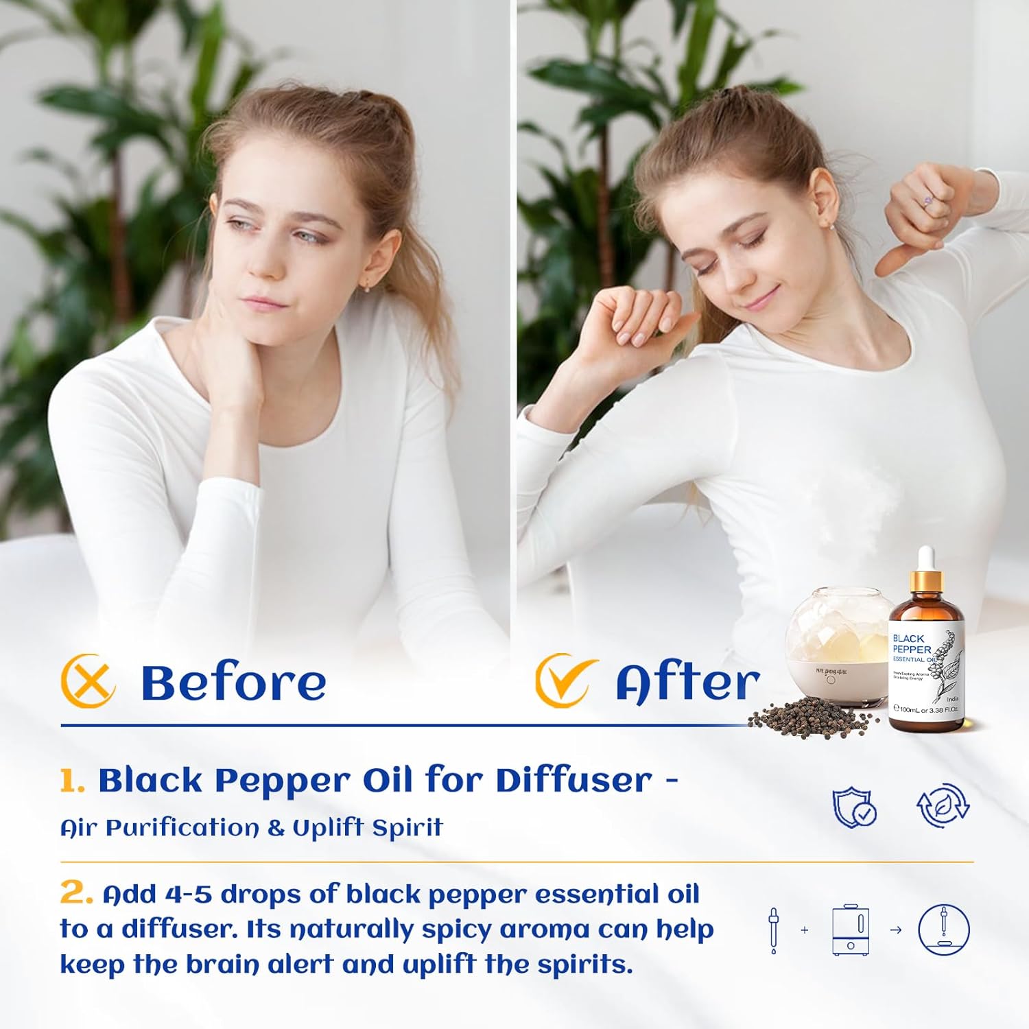 - Multiple use scenarios: Add 3-4 drops of black pepper essential oil to the diffuser to help purify the air, suitable for yoga, meditation, reading, massage, aromatherapy, sauna, spa, bedroom, living room, bathroom, shower room, etc