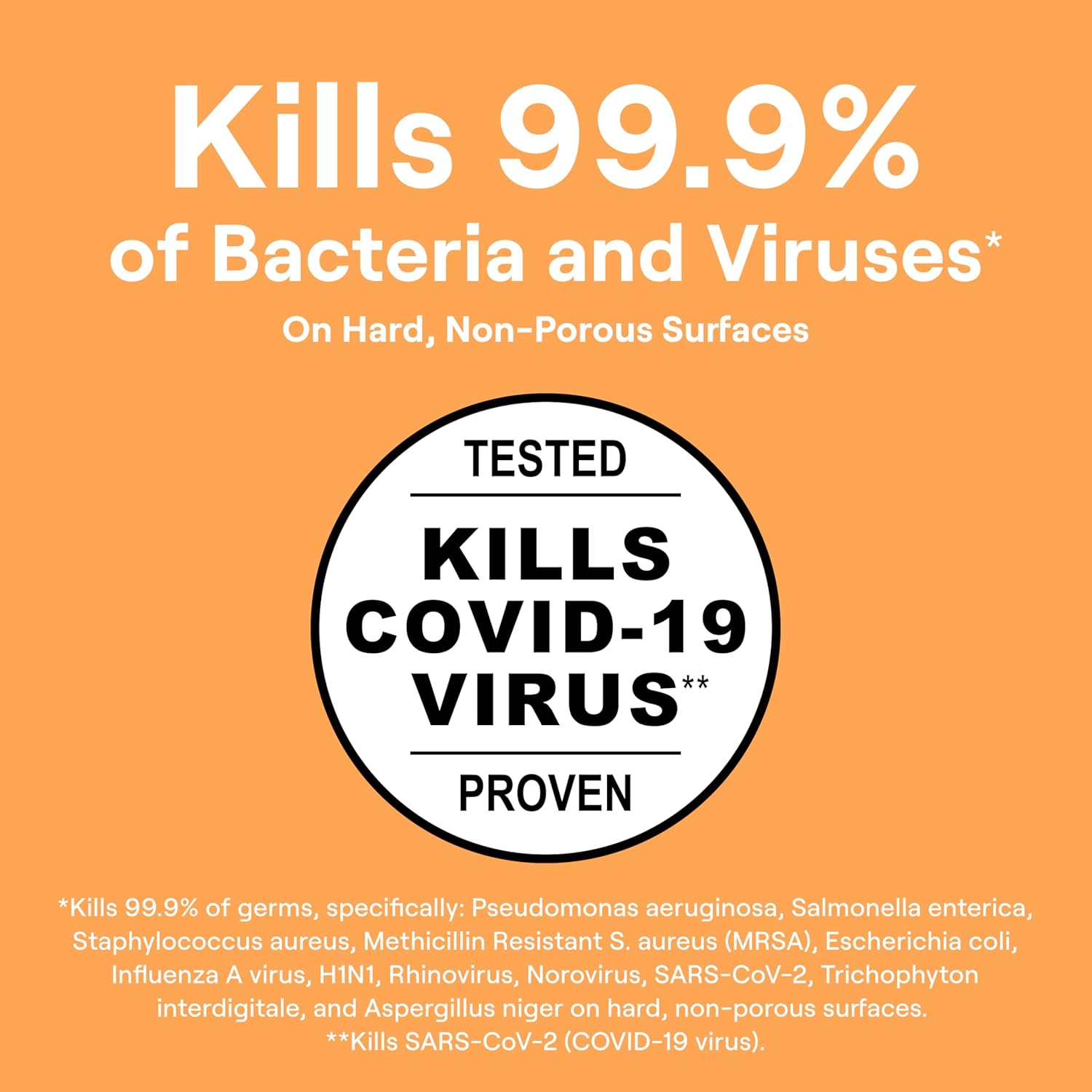- Disinfecting Multi-Surface Cleaner kills 99.9% of bacteria and viruses* and COVID-19 virus** on hard non-porous surfaces (refer to product label for details)