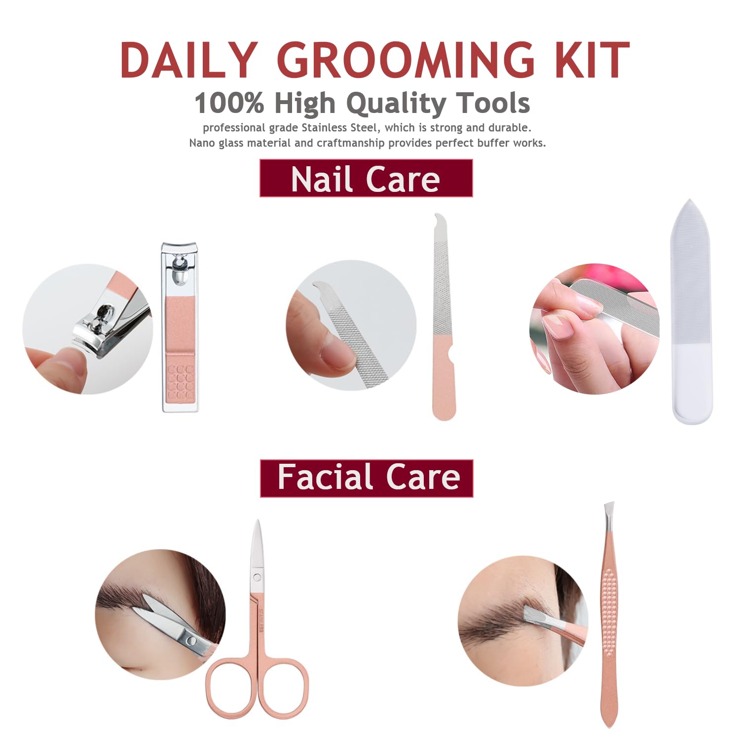 - Multifunctional Manicure Set: The Professional Manicure Kit contains nail&toenail foot/pedicure care tools and facial care tools for daily grooming, including Nail Clipper, Nano Glass Nail Shiner Buffer Nail File(Crystal Shine Polisher for Natural Nails), Metal Nail File, Eyebrow Scissors and Tweezers.