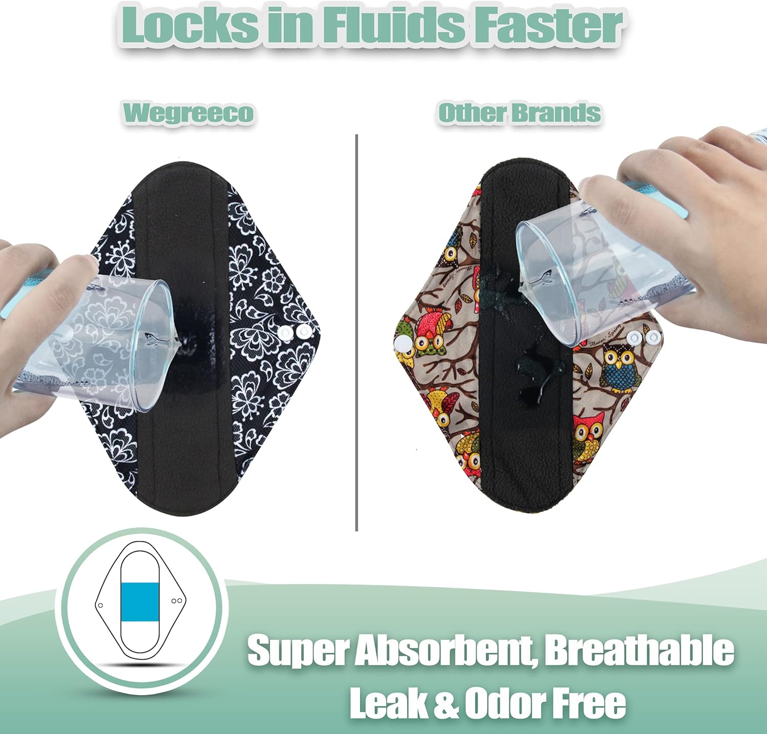 Wegreeco Reusable Menstrual Pads - Soft Cloth Sanitary Pads | Panty Liners - 6 Pack with 1 Cloth Wet Bag (Black, Grey Lace, Large)