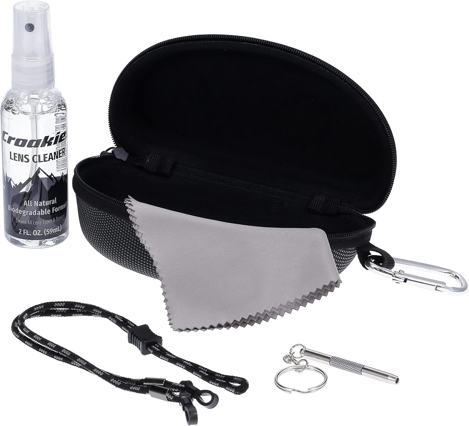 Croakies Eyewear Care Kit with 1(2oz) All Natural VOC Free Lens Cleaner + (1) Hard Case + (1) Microfiber Cloth + (1) Eyewear Retainer + (1) Repair Tool (Grey/Black)