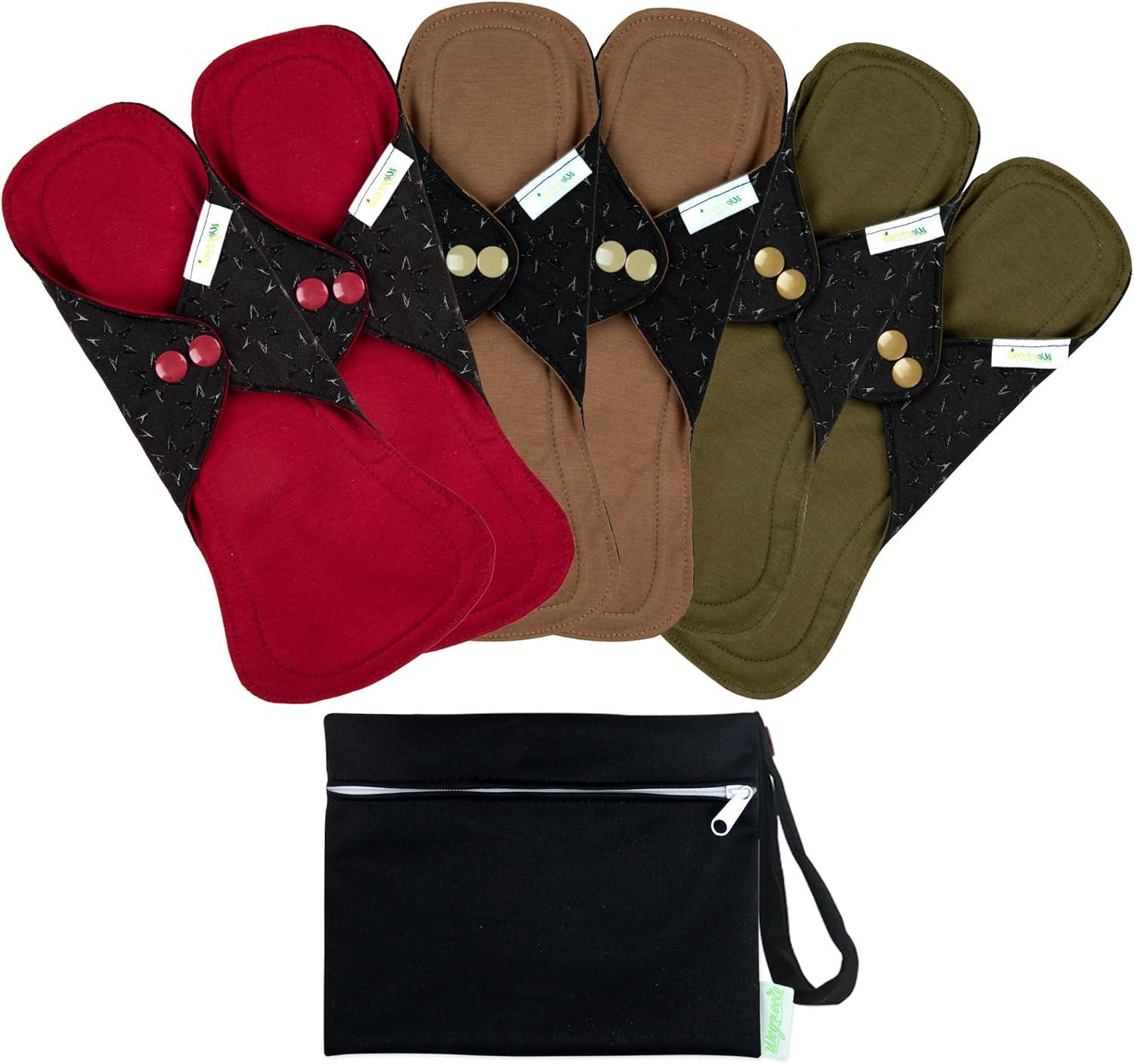 wegreeco 6 Pcs Reusable Menstrual Pads, Ultra Absorbent Cloth Pads for Heavy Flow, Sanitary for Teens, Women, Nonslip Panty Liners + Bag (Aqua, Burgundy, Coffee, M)