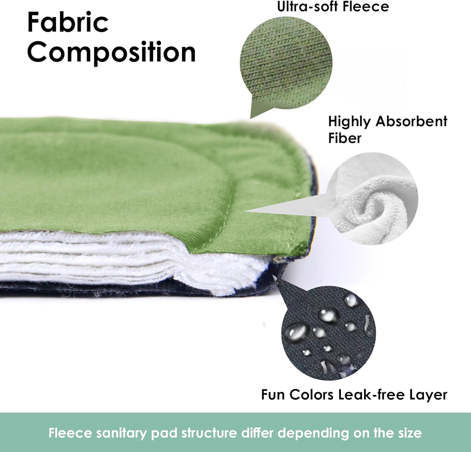 - Breathable Rayon Made from Bambo Layer: Cloth panty liners structure differ depending on the size. Menstrual cloth pads Inner layer is ultra-soft lays against your skin, moistures wicking, and neutralizes odor. Lining layer is super-absorbent fleece, and different sizes the layers are different. Outshell layer is leak-free TPU with backside silicon dot. The soft and gentle reusable sanitary pads offer great coverage and absorbency to keep you from any leaks and spills