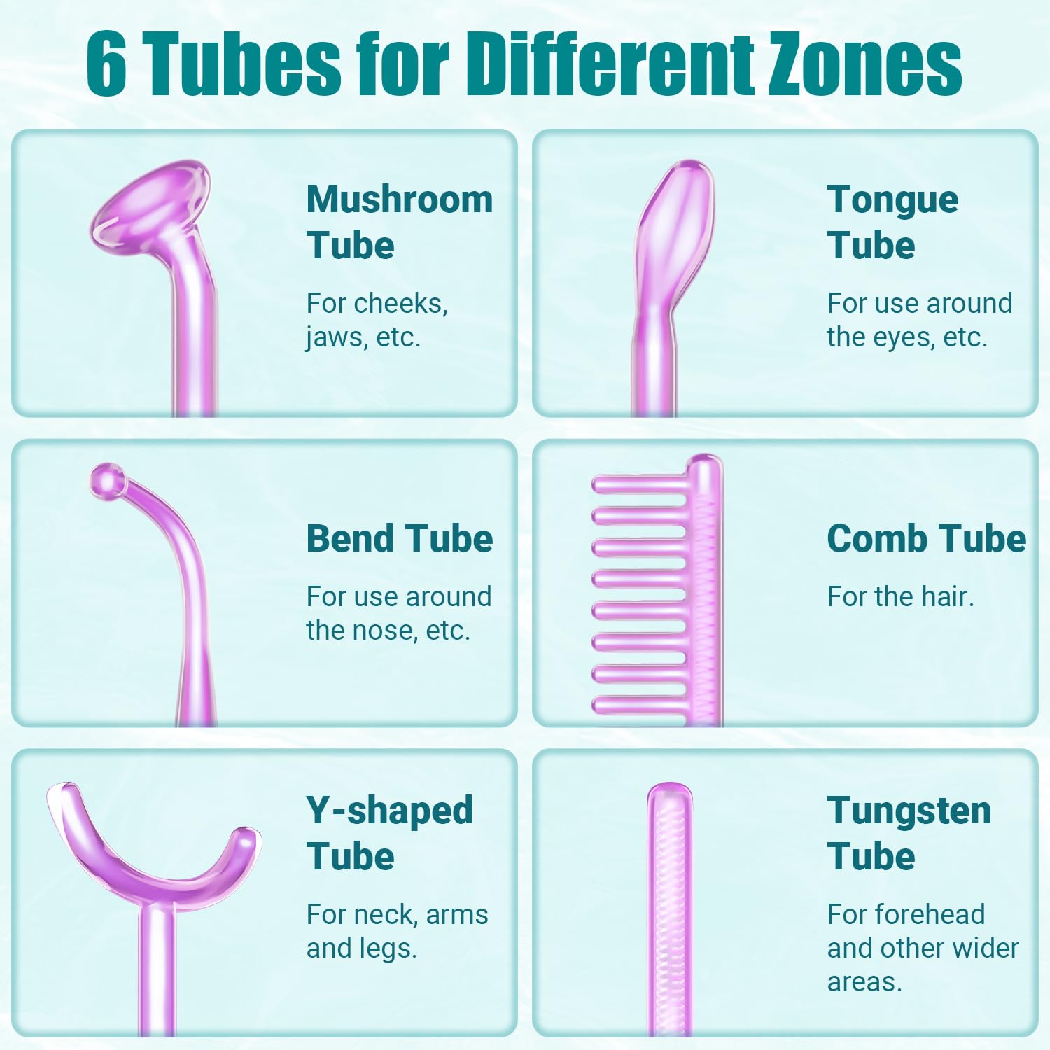 - 6 Different Glass Tubes for Your Needs: This portable high frequency facial machine provides 6 different glass tubes to meet your needs, allowing you to focus on all the different area. 1 Mushroom tube. 1 Tongue tube. 1 Bend tube. 1 Y Shaped tube. 1 Tungsten tube. 1 Tube