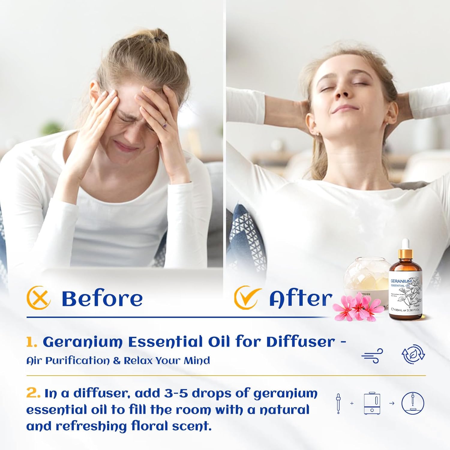 HIQILI 100ML Geranium Essential Oil for Skin, Diffuser & Candle, 100% Pure and Natural - 3.38 Fl Oz