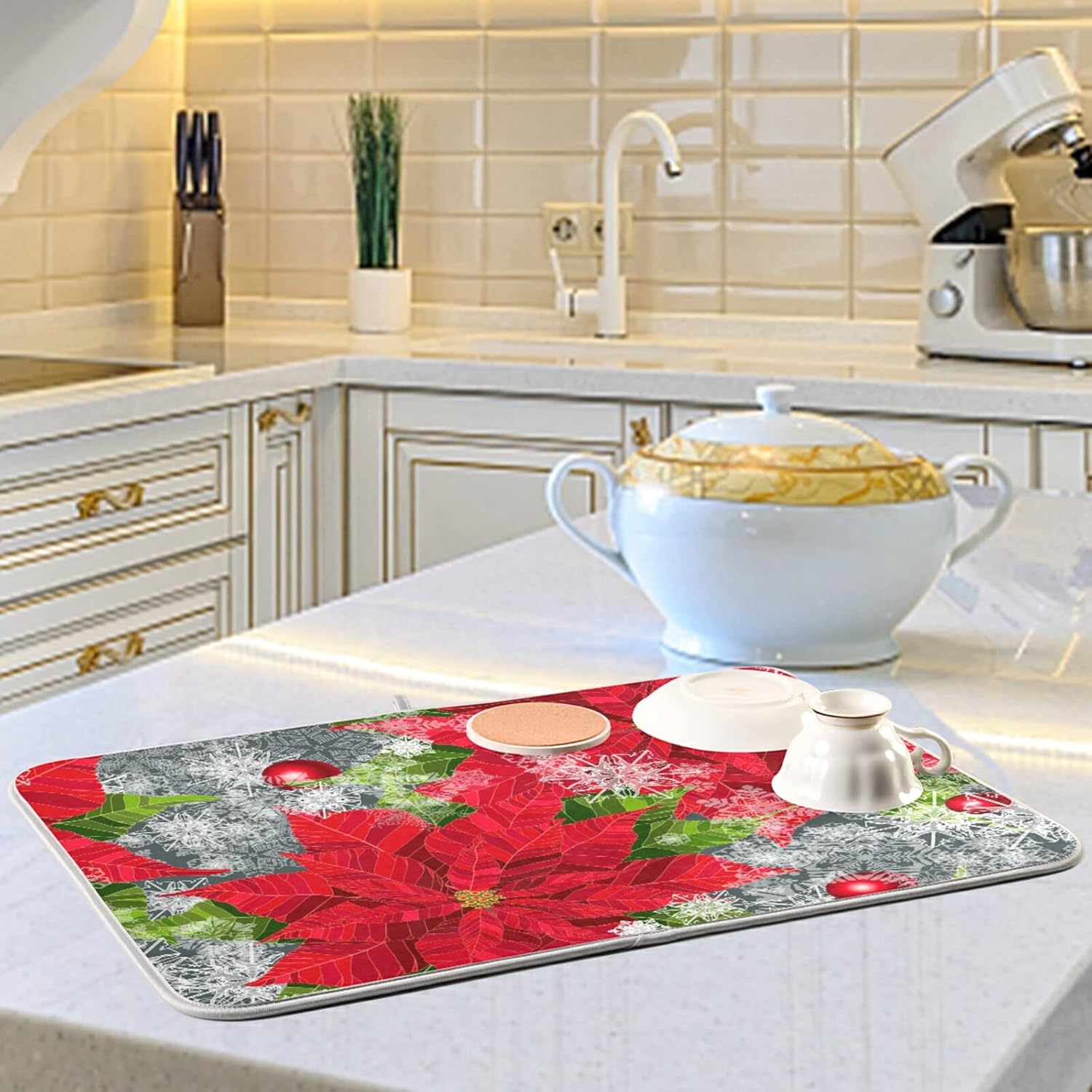 Happy Holidays Poinsettias Flower Christmas Microfiber Dish Drying Mat 18'' x 24'' for Kitchen Counter Drying Pad Dish Drainer Mats Absorbent Dish Draining Mat Extra Large
