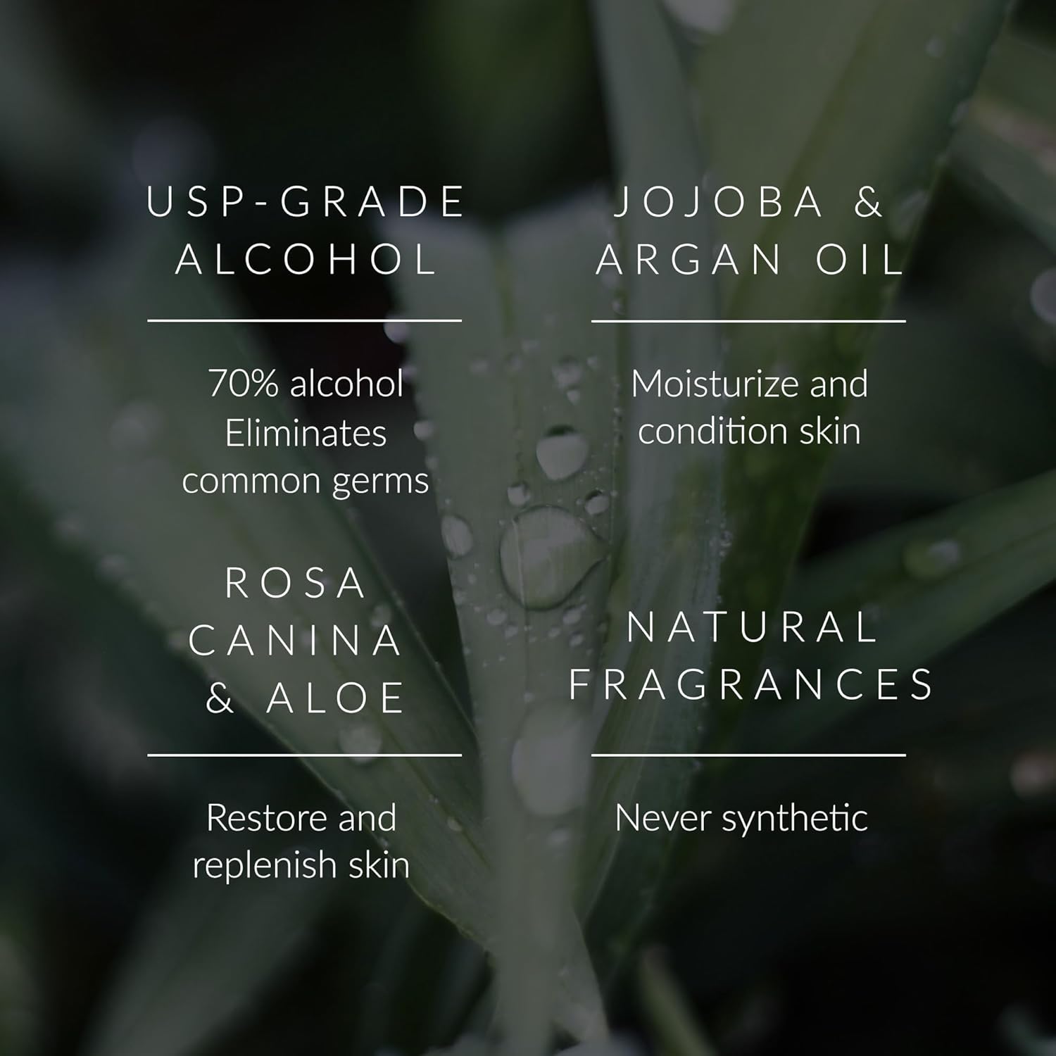 - MOISTURIZING, NON-STICKY SPRAY: 70% sugarcane-derived alcohol plus Jojoba, Argan, Rosehip, and Coconut oils. This hand sanitizer spray bottle is effective against common bacteria while keeping hands soft, not dry or sticky, and works perfectly as a travel size hand sanitizer.