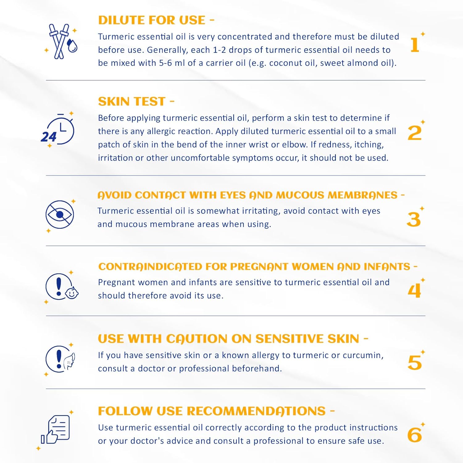 - Multi-Purpose: Turmeric essential oil can be added in skin care products like toner/serum/creams for dark spots, prevent and reduce fine lines and wrinkles. Or into warm water, soak your feet for inflammation. Also dilute 3% with base oil and apply to painful area or feet and massage
