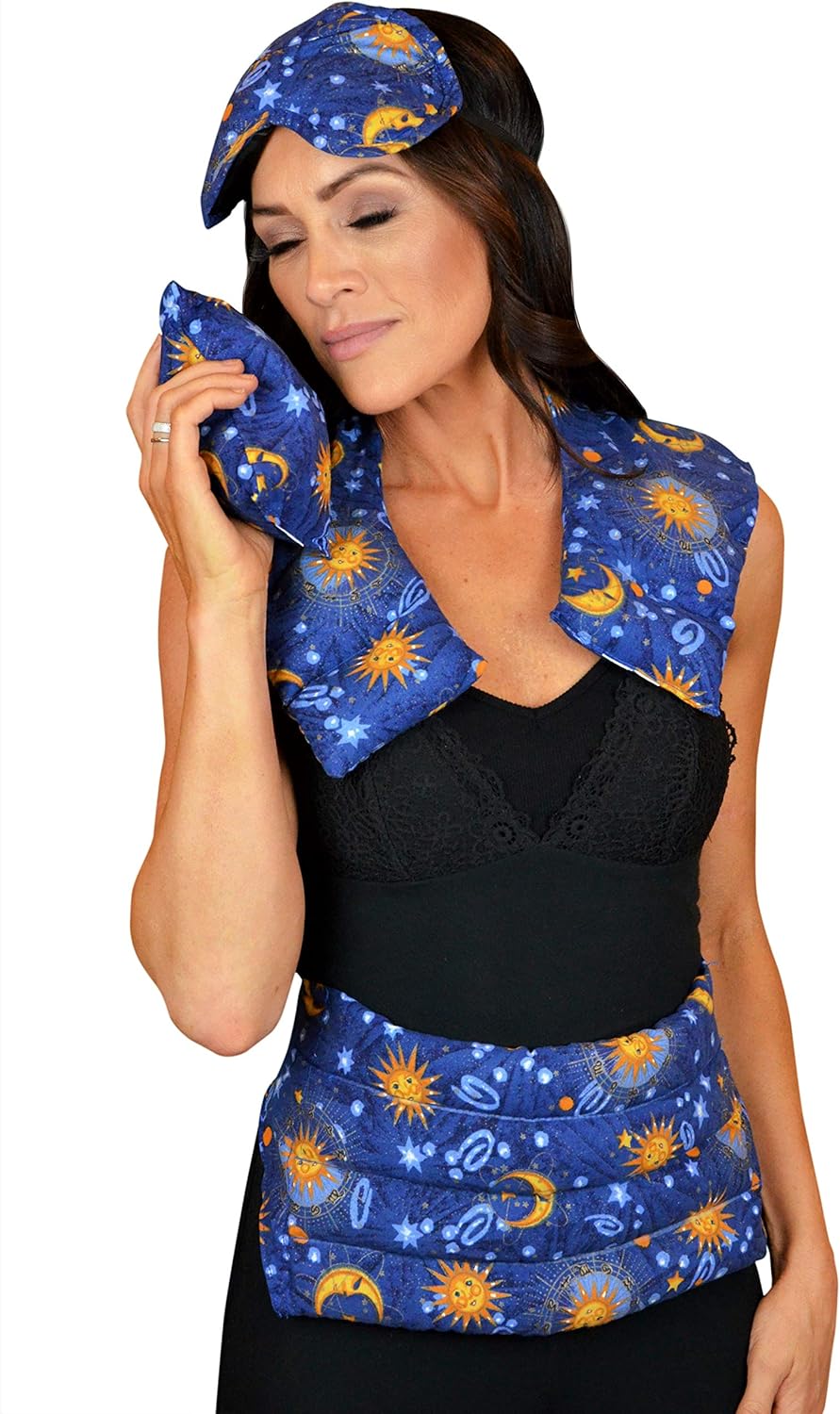 - AT HOME SERENITY: The full 4-piece set includes a wrap for the chest, neck, and shoulders, a belted lumbar wrap for the hips, abdomen, and lower back, an eye mask to relieve headaches and aching eyes, and an all-purpose aromatherapy pack