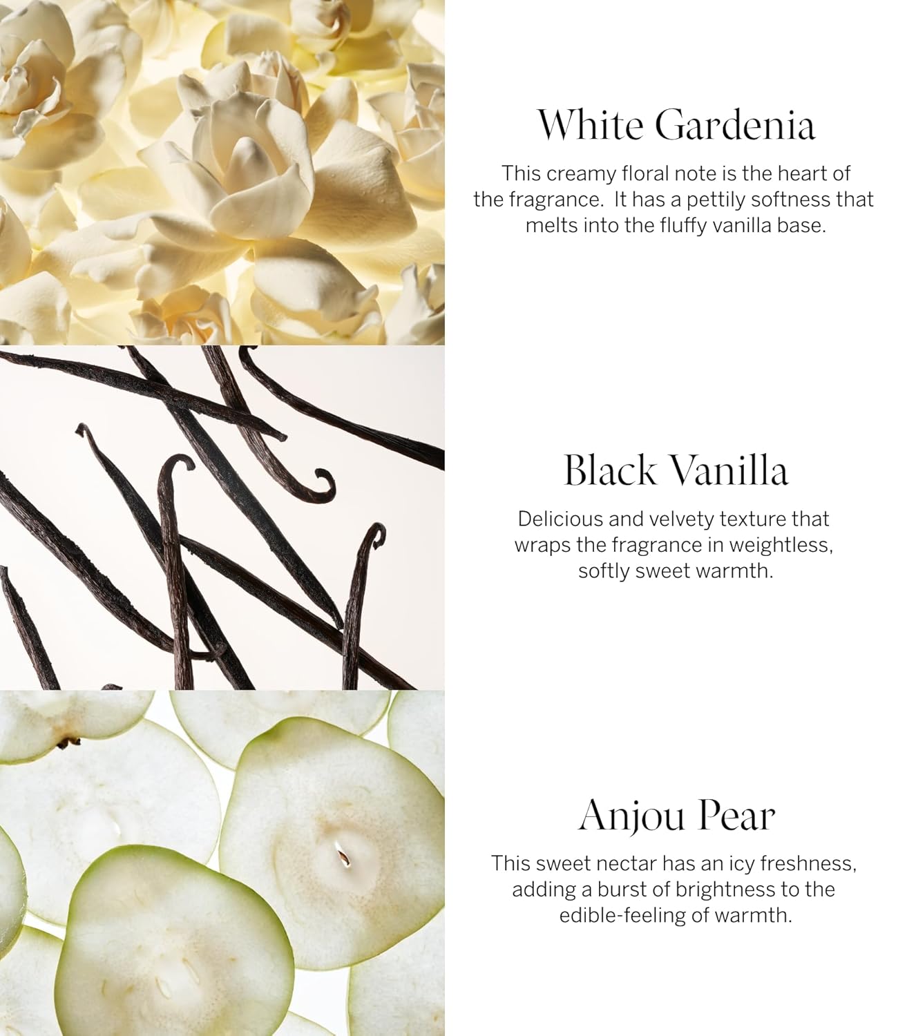 - Scent notes of white gardenia, anjou pear, and black vanilla.