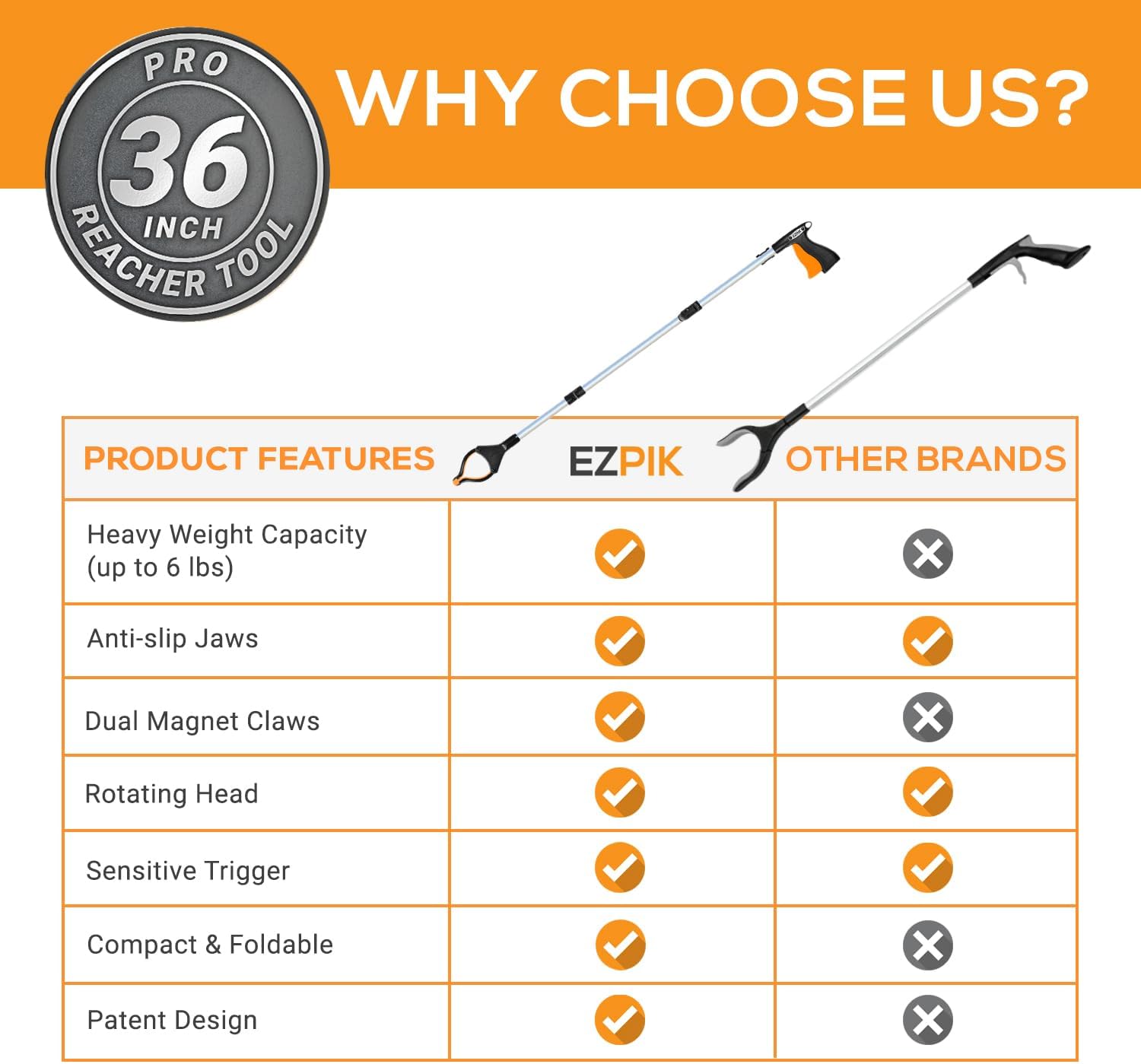 EZPIK® Grip Aid Tool Grabber Reacher + Magnets - Grabbers for Seniors, Trash Picker Upper Grabber - Trash Grabber Tool- Reacher Grabber Pickup Tool (Silver, 36″ (Pack of 2))