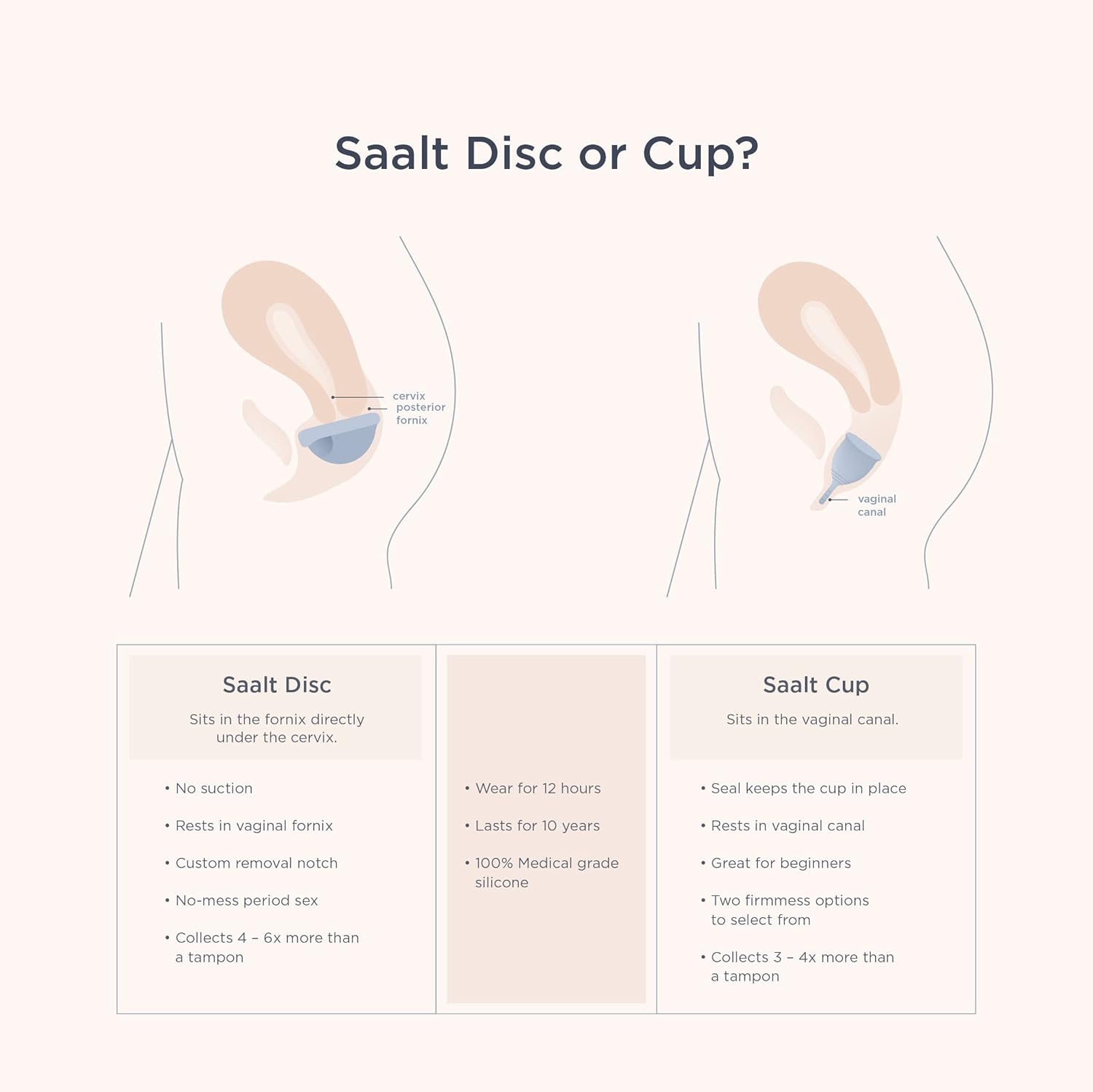 - REUSABLE & RELIABLE - Saalt Disc: At Your Cervix! No more timing your tampons. Wear your disc all day or night for up to 12 hours. Saalt Discs hold up to 6 tampons worth of flow and last up to 10 years, so you can spend less, waste less, and enjoy period week without the leaks.