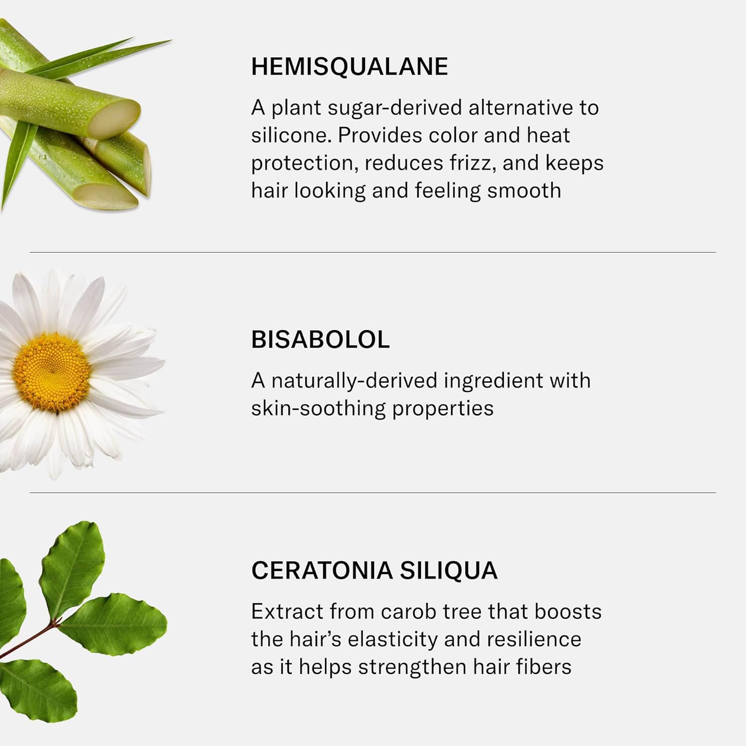 - Hero Ingredients: Hemisqualane – a plant sugar-derived alternative to silicone that provides color and heat protection, reduces frizz, and leaves hair smooth. Bisabolol – a naturally derived ingredient with skin-soothing benefits. Ceratonia Siliqua – carob tree extract that boosts elasticity and strengthens hair fibers. Moringa Oleifera – horseradish tree extract that shields hair from pollution and UV rays. Squalane – a plant-derived moisturizer that nourishes, restores luster, and adds shine.