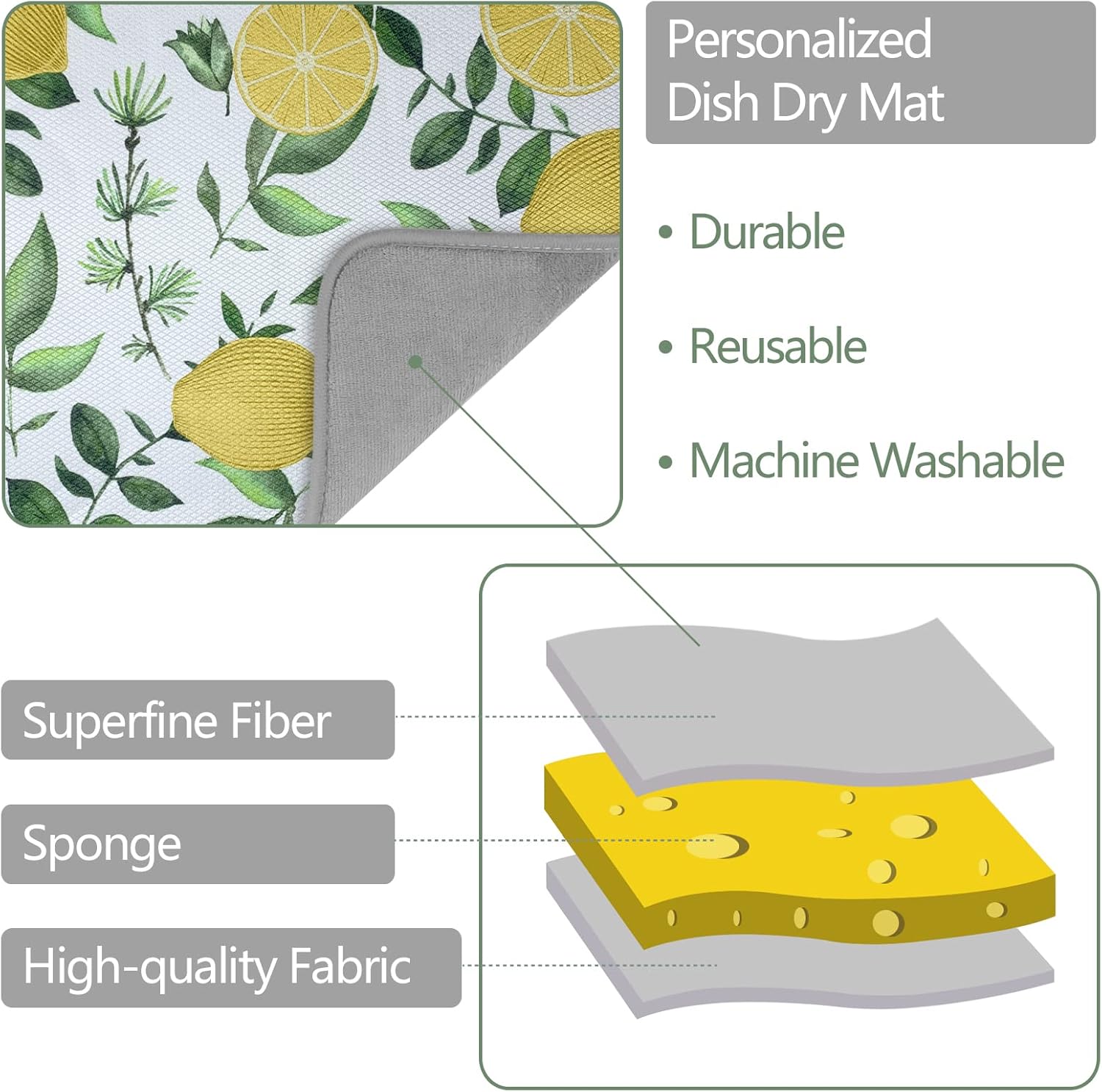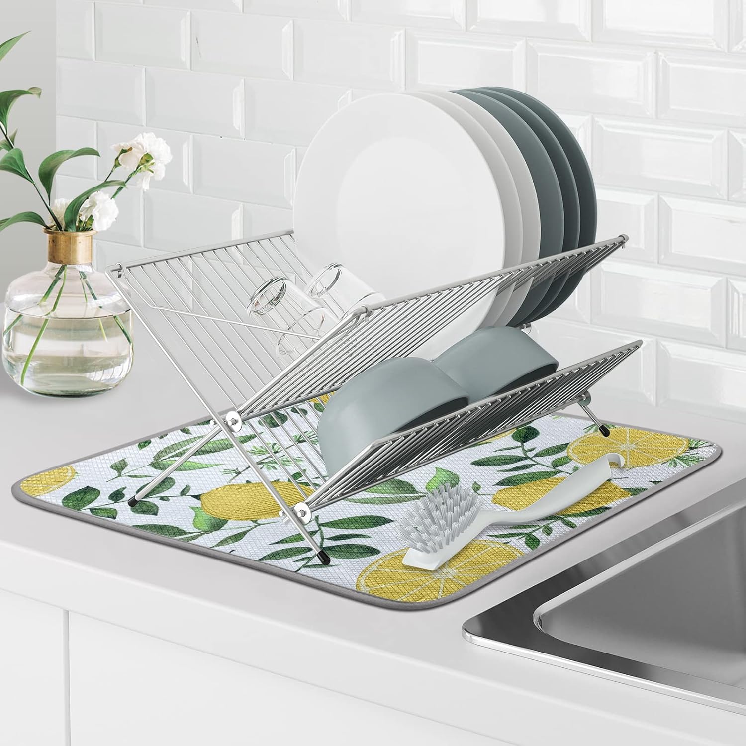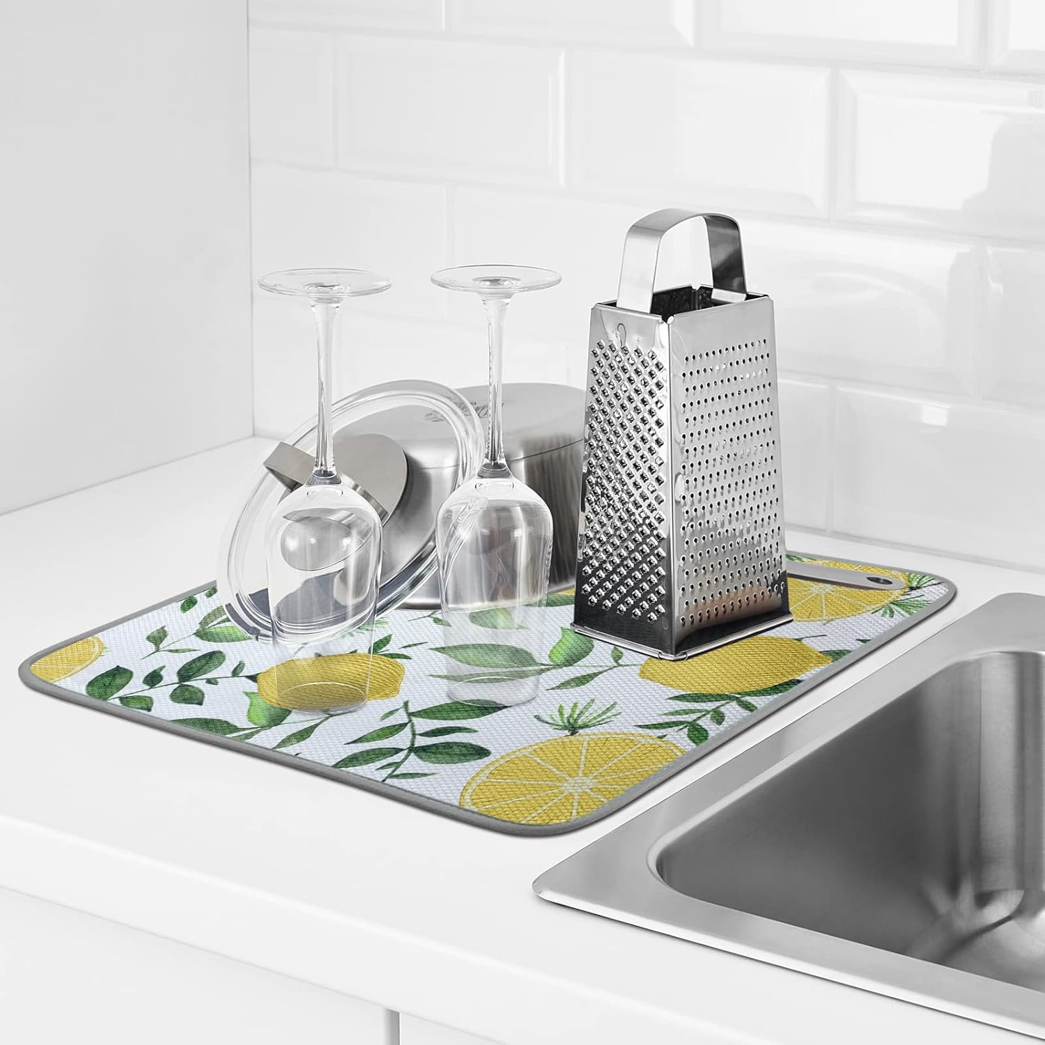 SHIYUE Dish Drying Mat for Kitchen Counter Super Absorbent Spring Kitchen Decor Microfiber Drying Matainers Rack Fast Pad Dish Drainer Mats(Yellow Lemon Green Leaves,16''x18'')