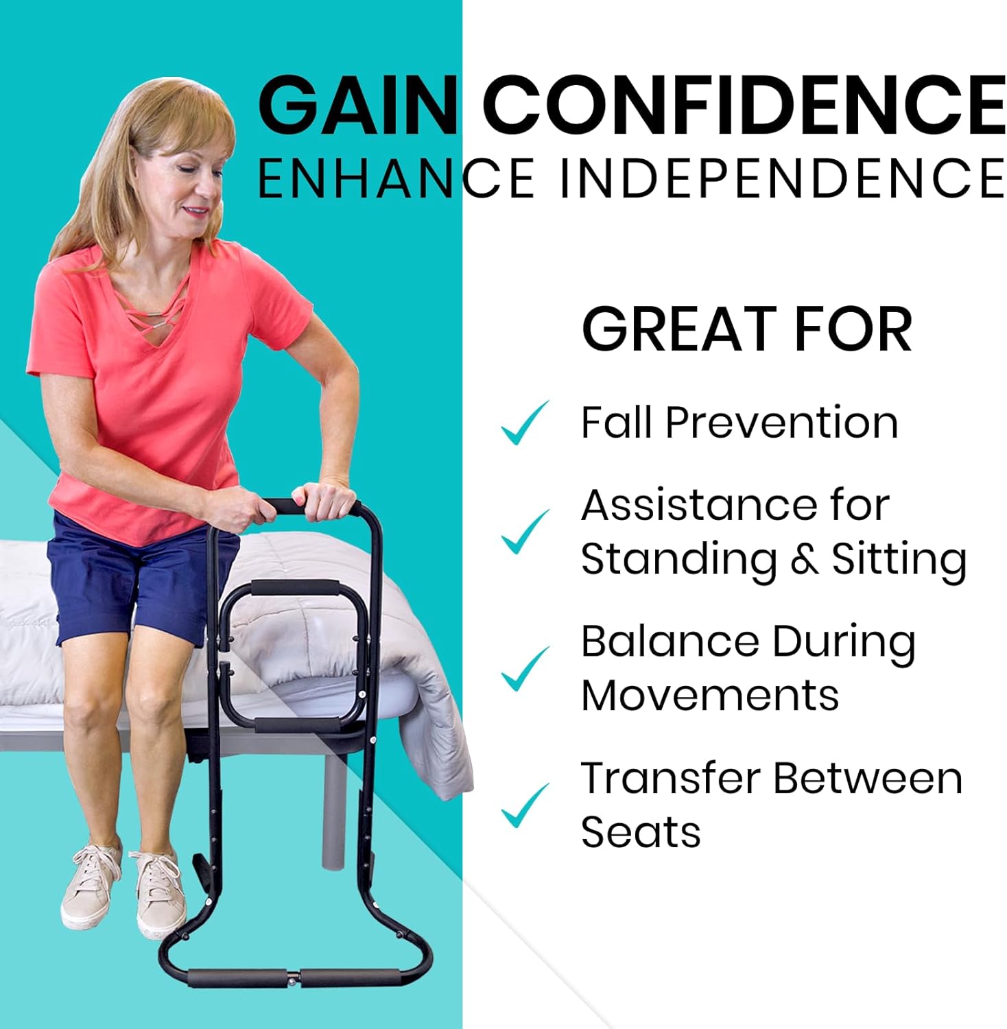 - STAND ALONE STYLE FOR VERSATILE USE: The stand-alone design of this assistive aid provides you with the freedom to use it in any room or area of your home. No need to worry about installation or attaching it to furniture – simply place it where you need it most, and it's ready to support you. Whether you're in the living room, bedroom, or bathroom, this stand-alone aid offers reliable assistance for sitting and standing to reduce the risk of falls.