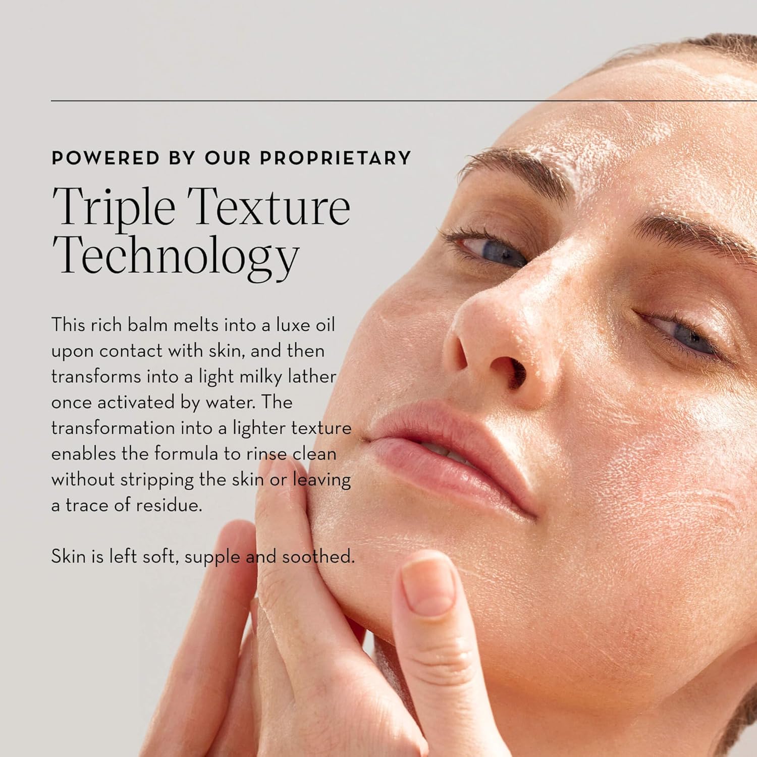 - Triple Texture Technology: Unique formulation transitions from a solid balm to a nourishing oil and then to a light, milky lather, ensuring a residue-free finish.