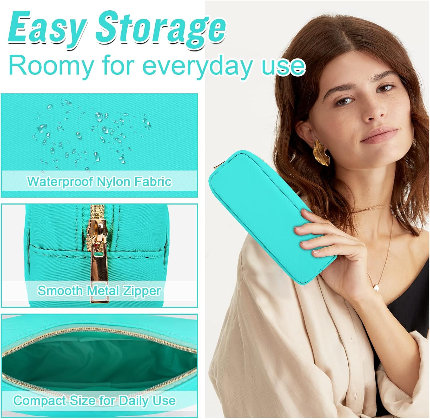 izuzta Nylon Small Makeup Bag Slim Pouch, Preppy Cute Makeup Brush Case Bag Cosmetic Zipper Pouch for Purse, Waterproof Travel Toiletry Bag Clutch Coin Pouch Makeup Organizer for Women Girls(Mint)
