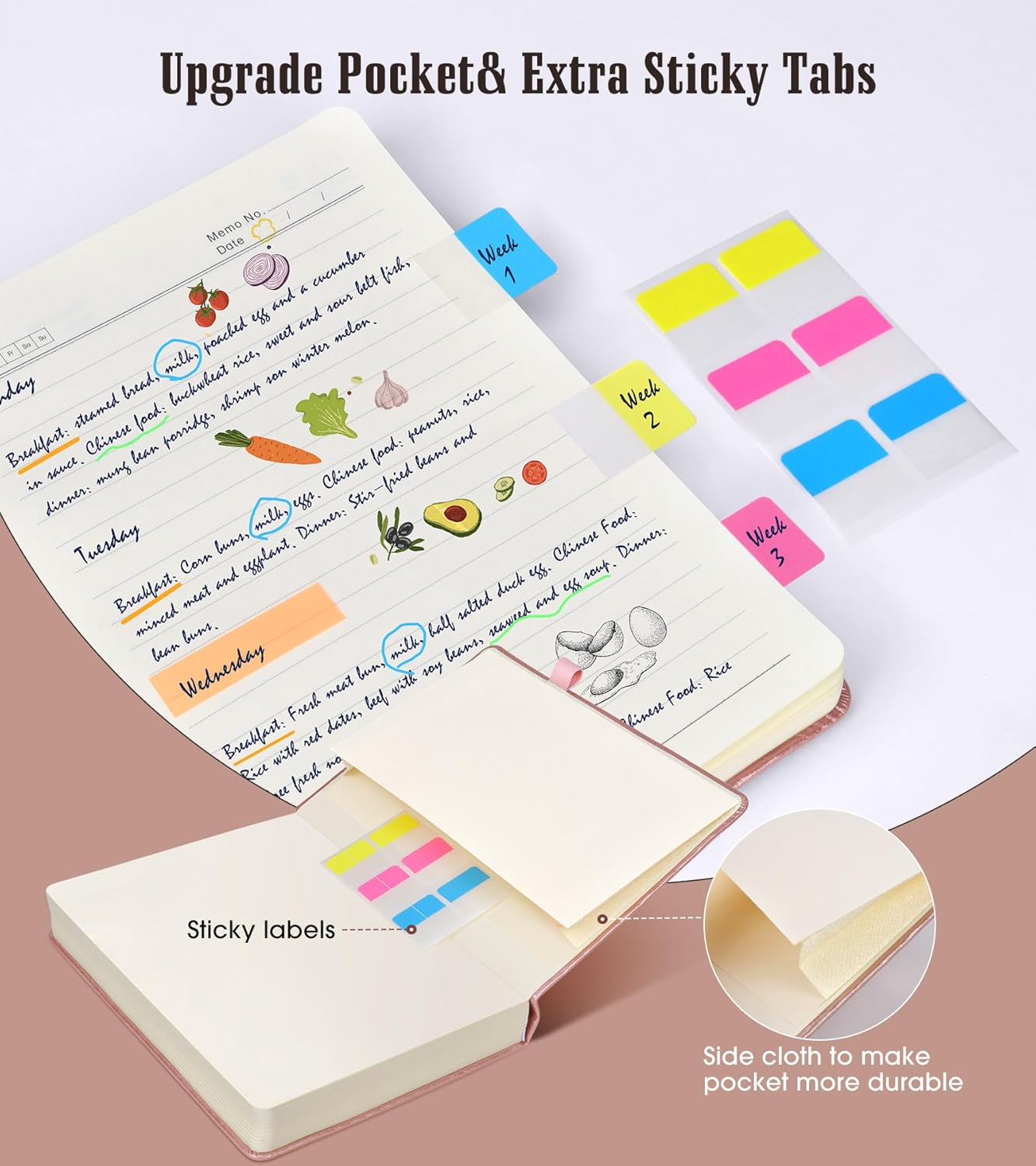 - 【Upgrade Lined Journal Notebook】Comes with 1 elastic closure band & 1 elastic bookmark band, more stable. An expandable inner storage pocket to keep track of appointment cards,notes,receipts,and more. 1 gift of multicolor index tabs stickers for papers classifying and marking.