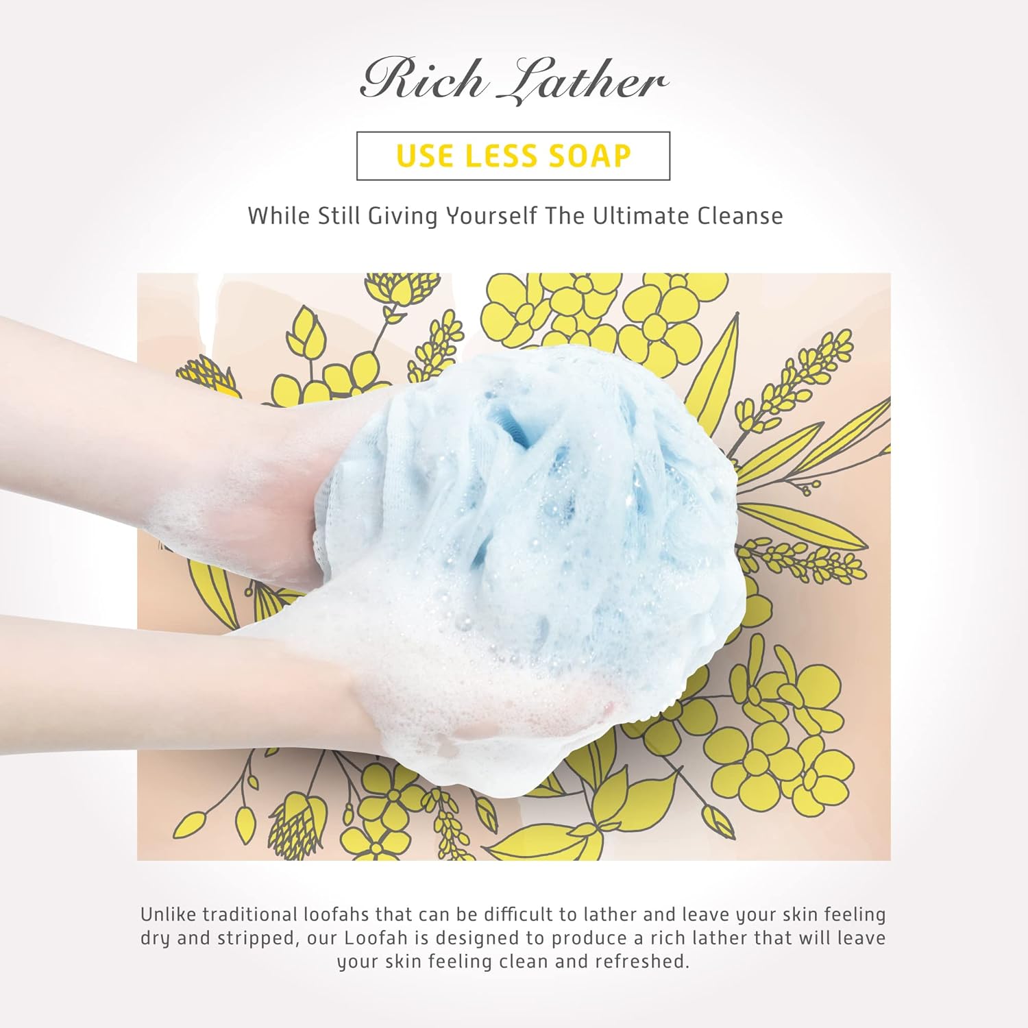 - RICH LATHER - Create a rich, foamy lather when used with your favorite soap or body wash. This loofah helps to whip up a thick and luxurious lather like never experienced before.