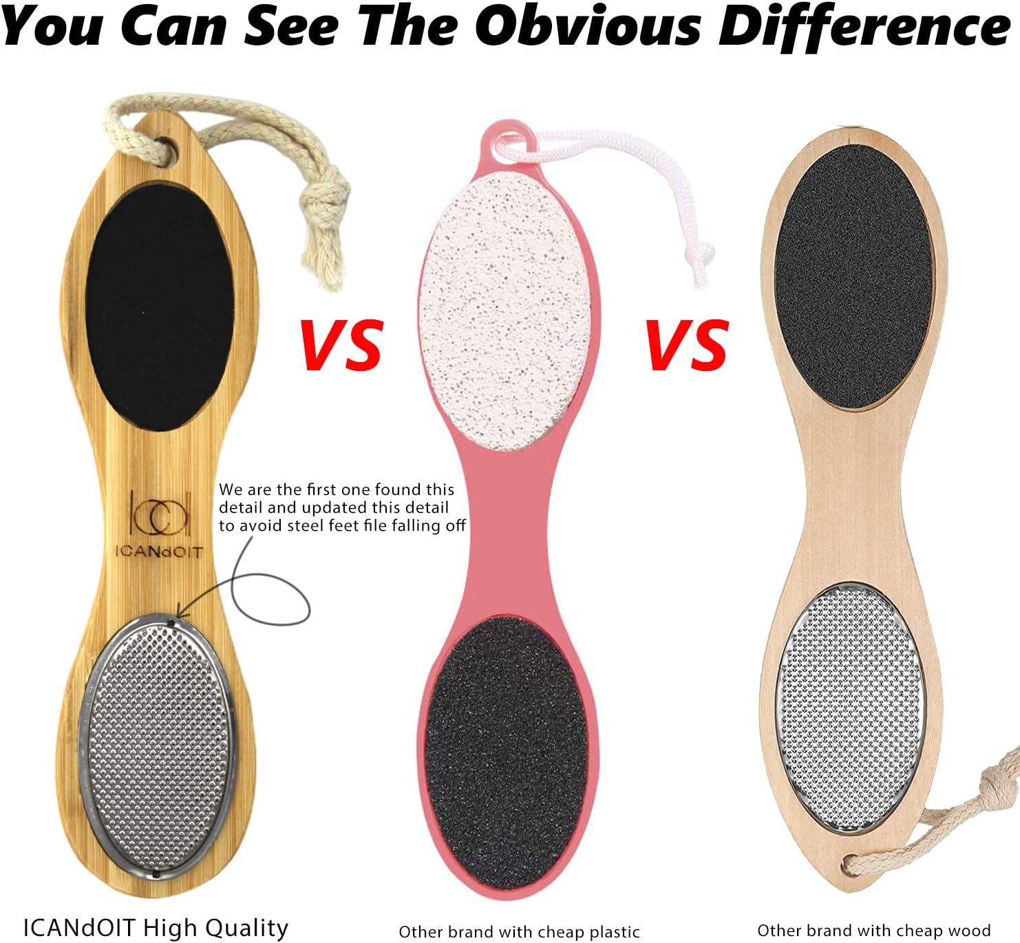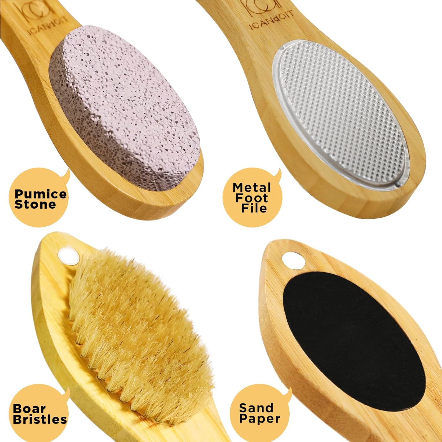 ICANdOIT-2 Packs Natural Bamboo Foot File Callus Remover-Multi Purpose 4 in 1 Feet Pedicure Kit with Boar Bristle Brush,Pumice Stone,Foot Rasp,Sand Paper
