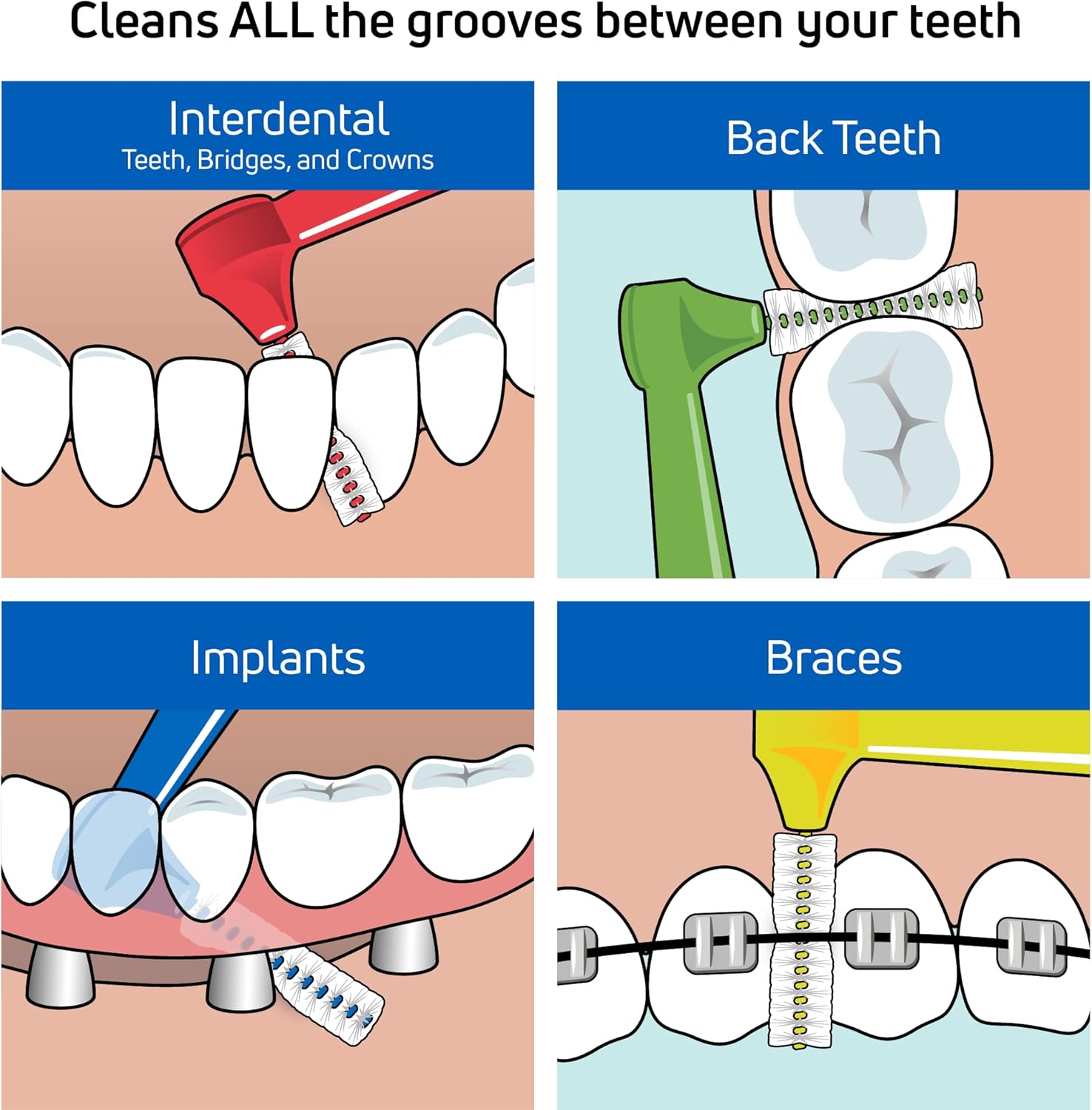 - VERSATILE TEETH BRUSH: The angled head cleans plaque that toothbrushes leave behind, and the long ergonomic handle offers total stability and movement control to reach tight spots between back teeth, braces, implants, crowns, and bridges.