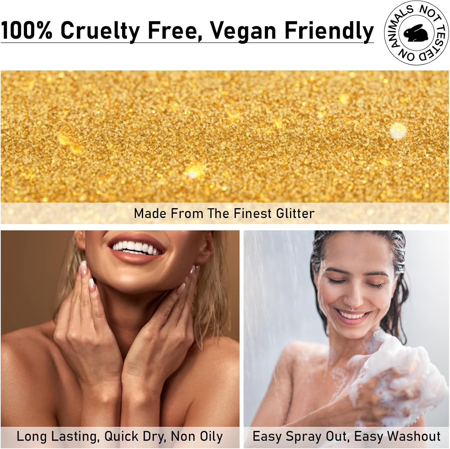 - Gold Glitter Spray: Gold shimmer spray can be used on the body, hair, and clothes to create a head to toe shimmering effect. Effectively enhances face and body contours with dimension and sparkle, matching perfectly with any makeup and outfit. Long-lasting sparkle, fast drying, non oily and non sticky.