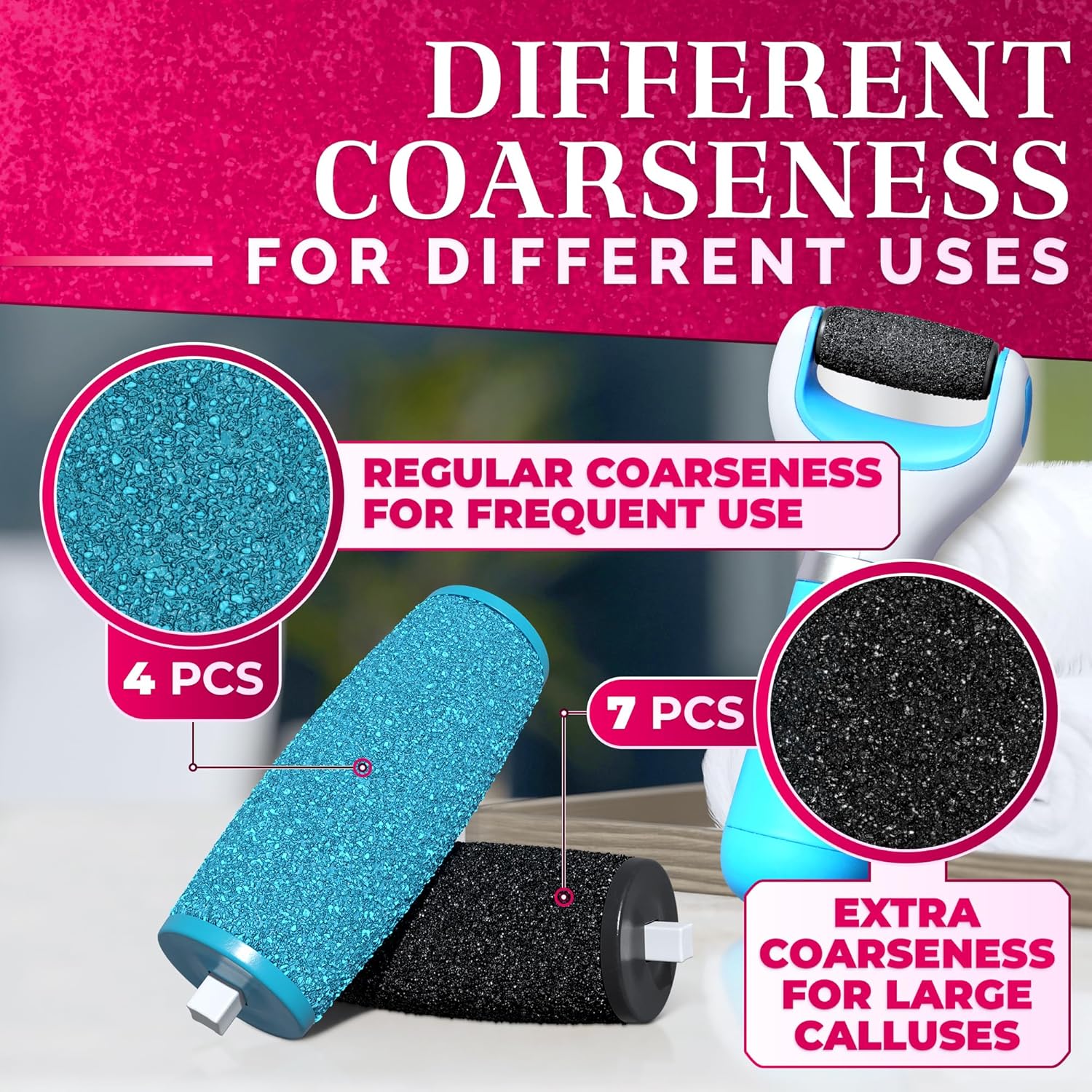 - Multi-Functional Replacement Rollers: Includes 7 extra coarse rollers for large calluses and 4 regular rollers for electric callus remover for feet, offering a complete solution for foot care needs