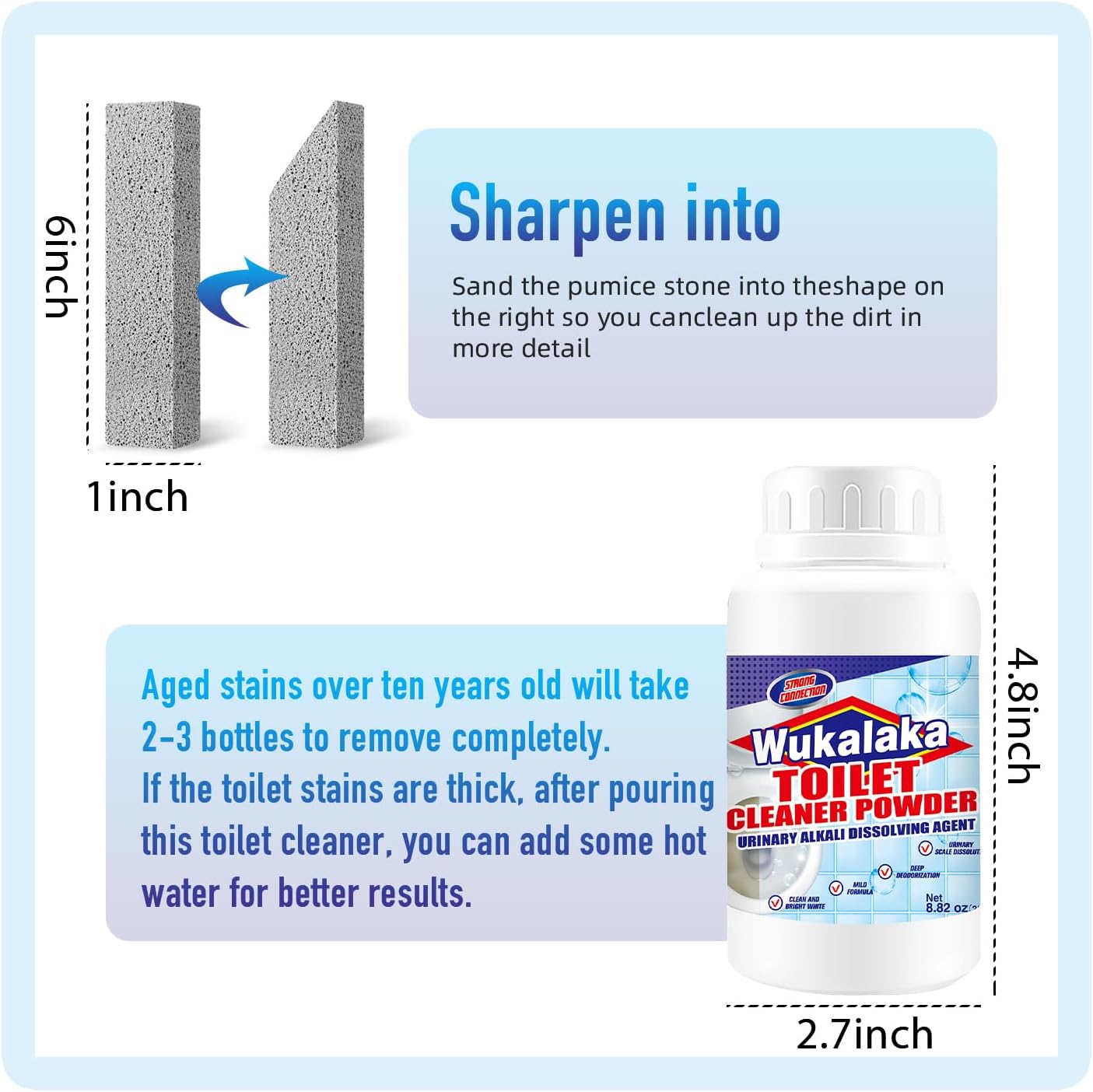 - IInstructions: Product 1 wet the pumice stone first for 15 to 20 seconds, then test in a small area, keep the pumice scrubber and toilet surface moist throughout use, and then wipe clockwise to easily remove the dirt.