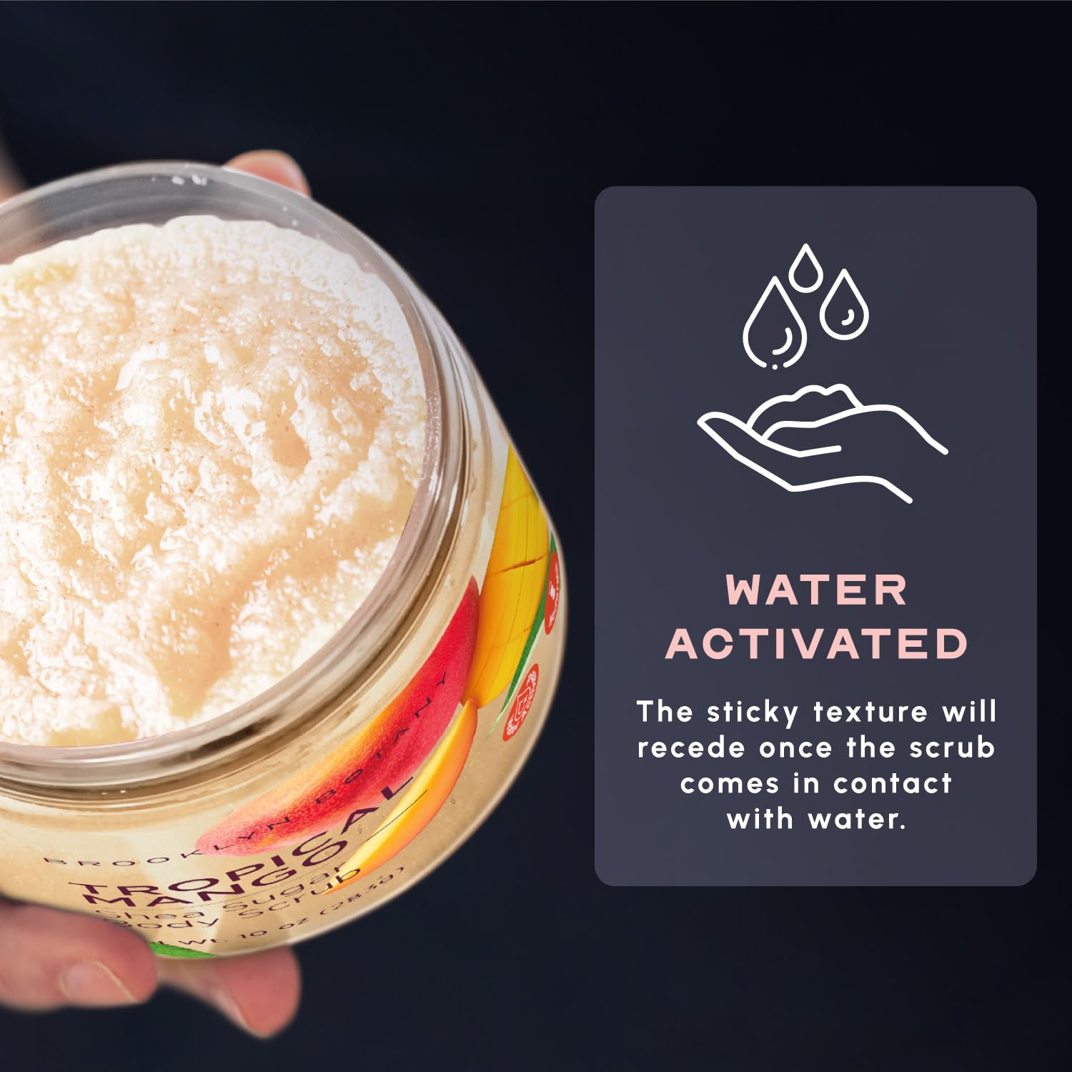 - WATER ACTIVATED – You will notice that the scrub has a sticky texture. Note that it was designed this way and the stickiness will recede once it comes in contact with water.