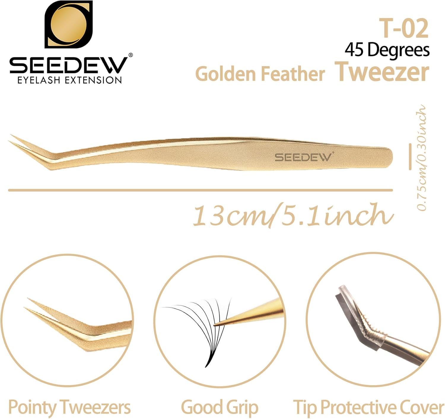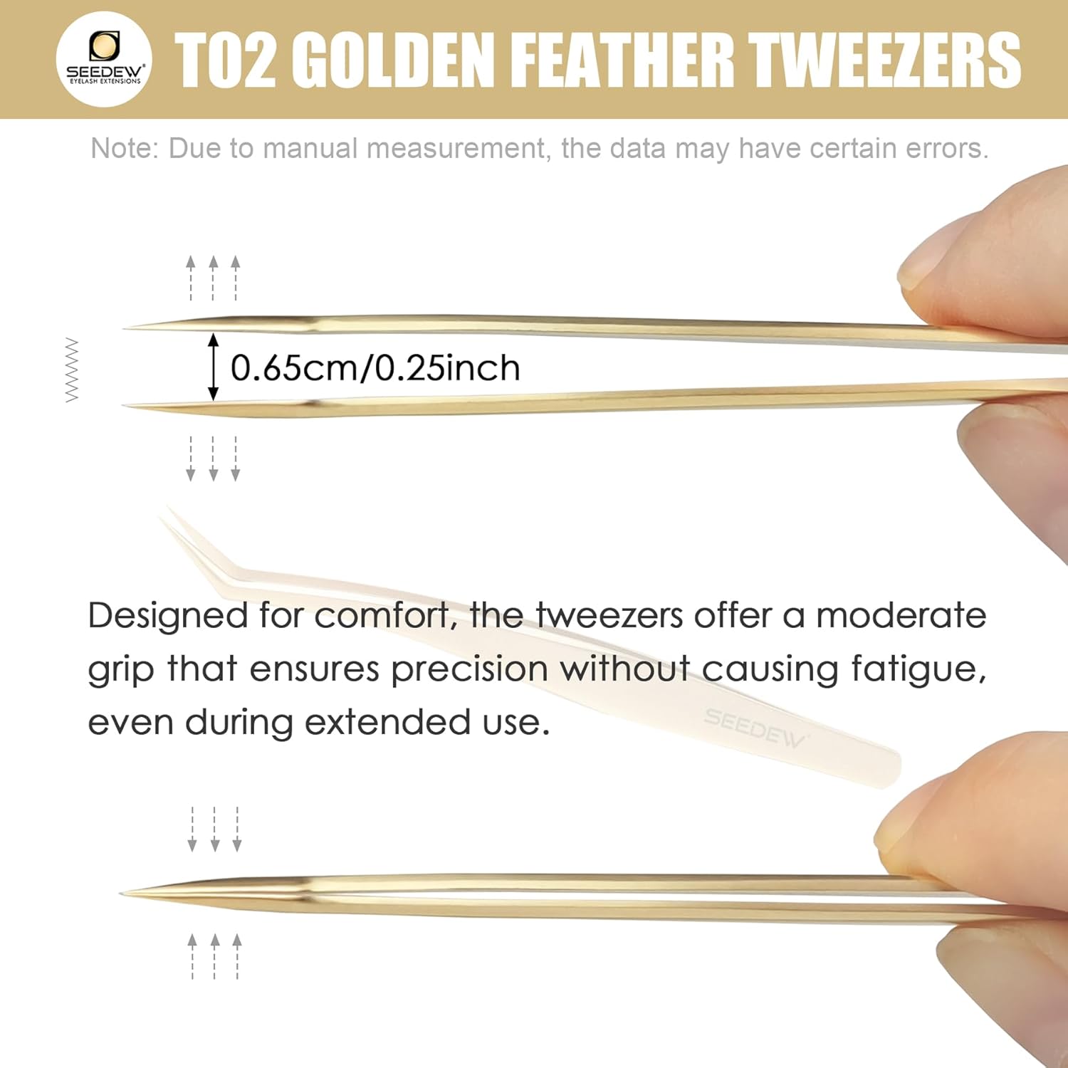 - 🌹【T02 Golden Feather Tweezers】The 45 degree Golden Feather Tweezers are the most popular style of tweezers that lots of eyelash artists like to use. They are mainly used for eyelashes blooming, or for picking up eyelashes for grafting.
