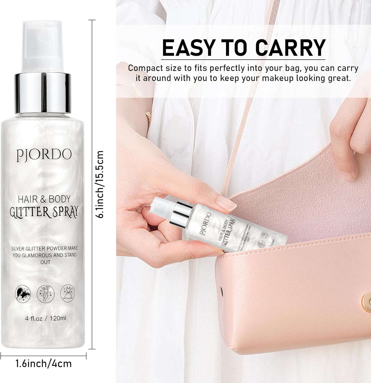 - Silver Glitter Spray: Silver shimmer spray can be used on the body, hair, and clothes to create a head to toe shimmering effect. Effectively enhances face and body contours with dimension and sparkle, matching perfectly with any makeup and outfit. Long-lasting sparkle, fast drying, non oily and non sticky.