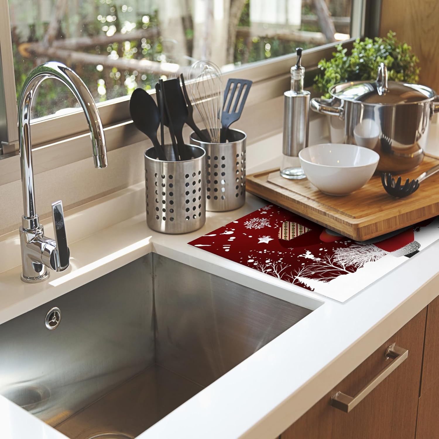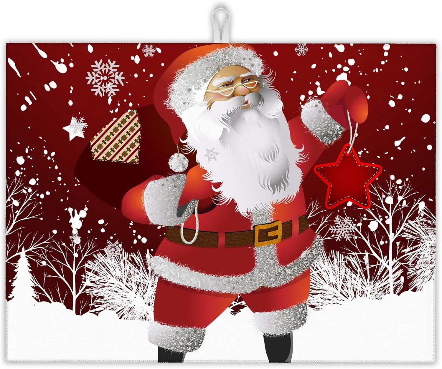 Christmas Santa Claus Dish Drying Mats 18x24 Inch,Christmas Snowflakes Dish Pad Drying Rack Mat for Kitchen Counter Ultra Absorbent Microfiber Dishware Coffee Maker Bar Countertop Decor