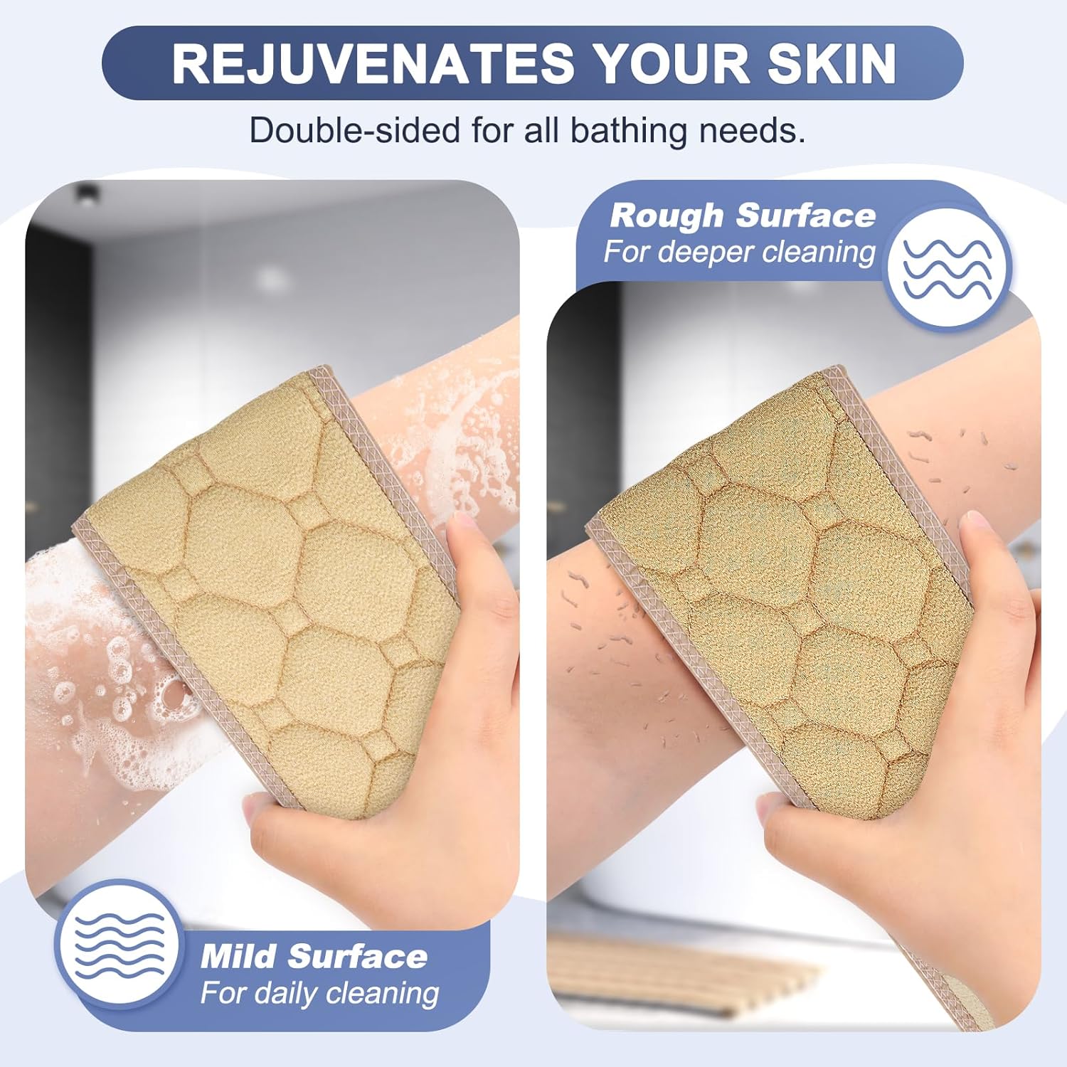 - 【What You Get】Double-sided exfoliating back scrubber * 1. If you have sensitive skin, you need to use it gently. Since it is mainly used for exfoliating, even the mild side has a degree of roughness. Great for dry rough skin and other skin concerns. In addition, hang the back washer to dry after each use for long-term use. (Note: Please wash it before FIRST use.)