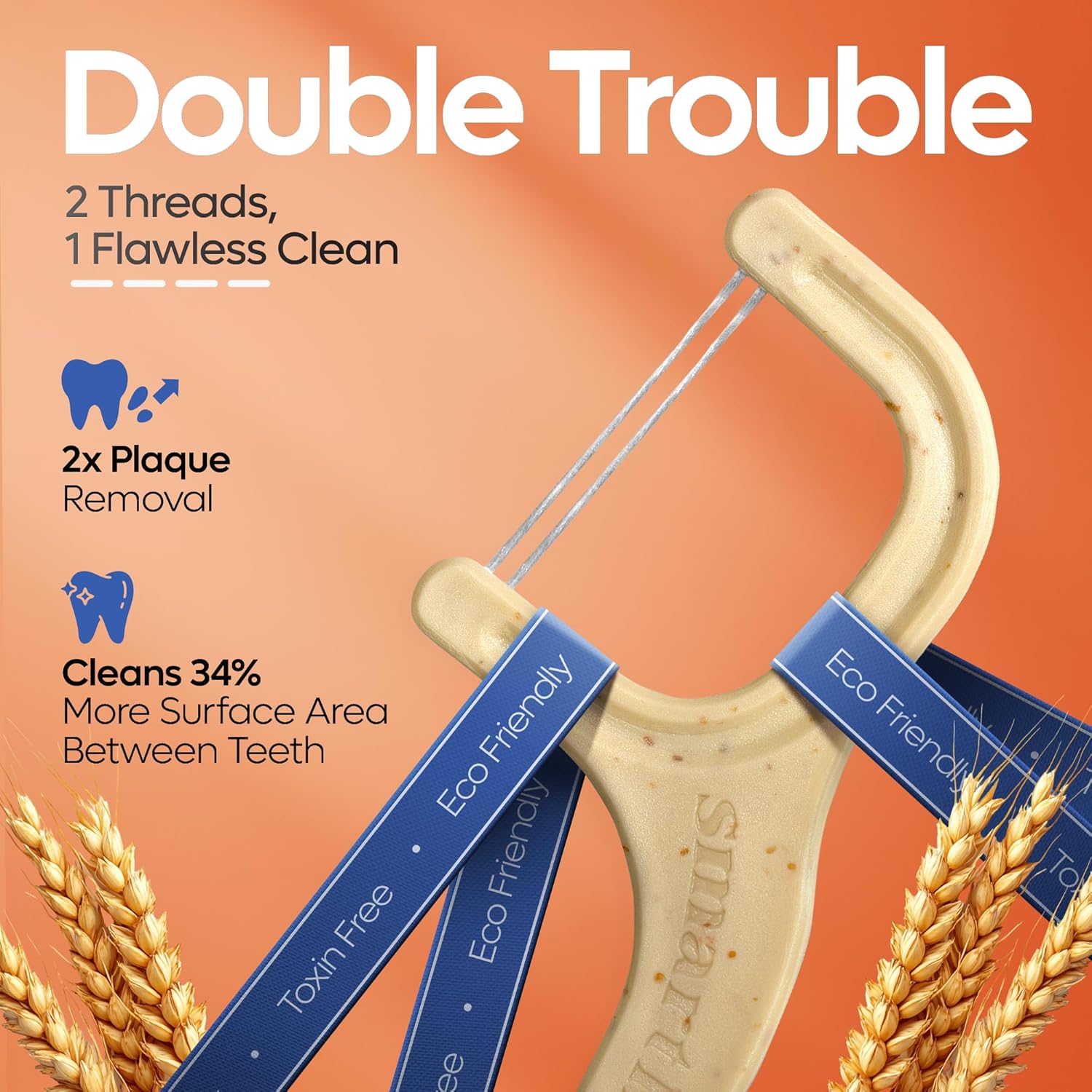 SmartLifeco Eco-Friendly Dual-Thread Dental Floss Picks (200ct) - Flossers Made with Straw Wheat Blend, Proven Anti-Shred for Tight Gaps, Tooth Pick Stick for Adults, Soft on Gum & Teeth, Unflavored