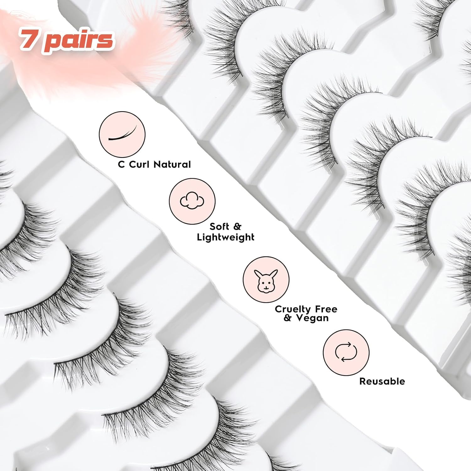 - VEGAN & REUSABLE: 7 pairs eye lashes pack. The fake eyelashes use ultra-light faux mink fibers, cruelty-free, skin friendly. Bring pretty natural lashes extension look without damaging your own eyelashes, suit for DAY-TO-DAY use, party and so on