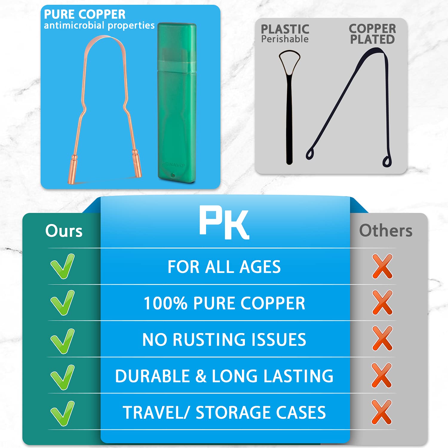 - 【Pure Copper Tongue Scraper】: The tongue scraper is an oral care product that combines Ayurvedic ideas and techniques. Ayurveda recommends using copper dental tools to improve taste and oral health. Copper has natural cleaning properties that help make tongue scraping more effective and prevent various oral problems such as bad breath, tooth decay, and more.